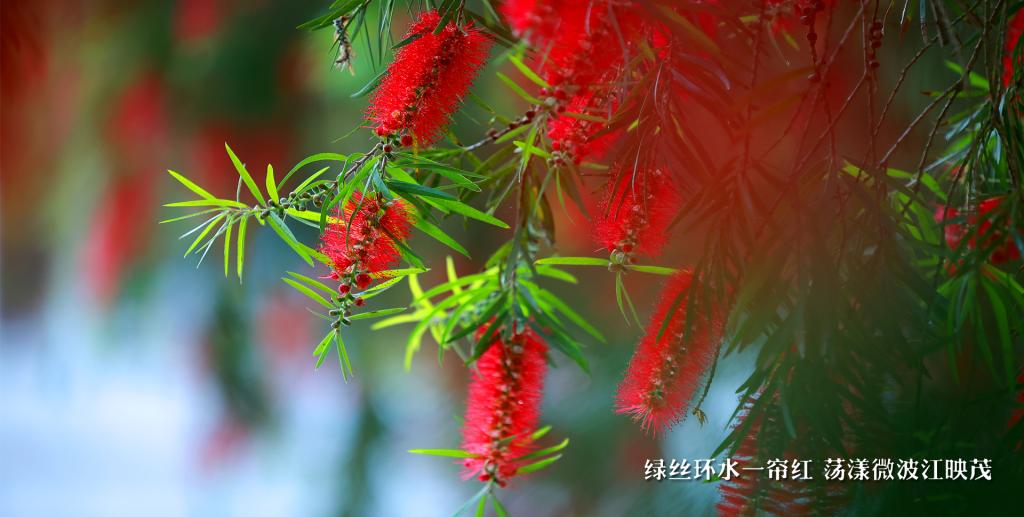 绿丝环水一帘红 荡漾微波江映茂