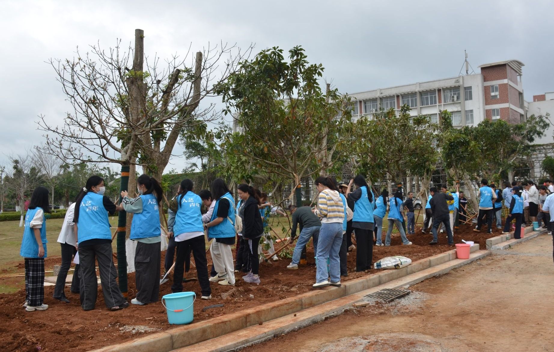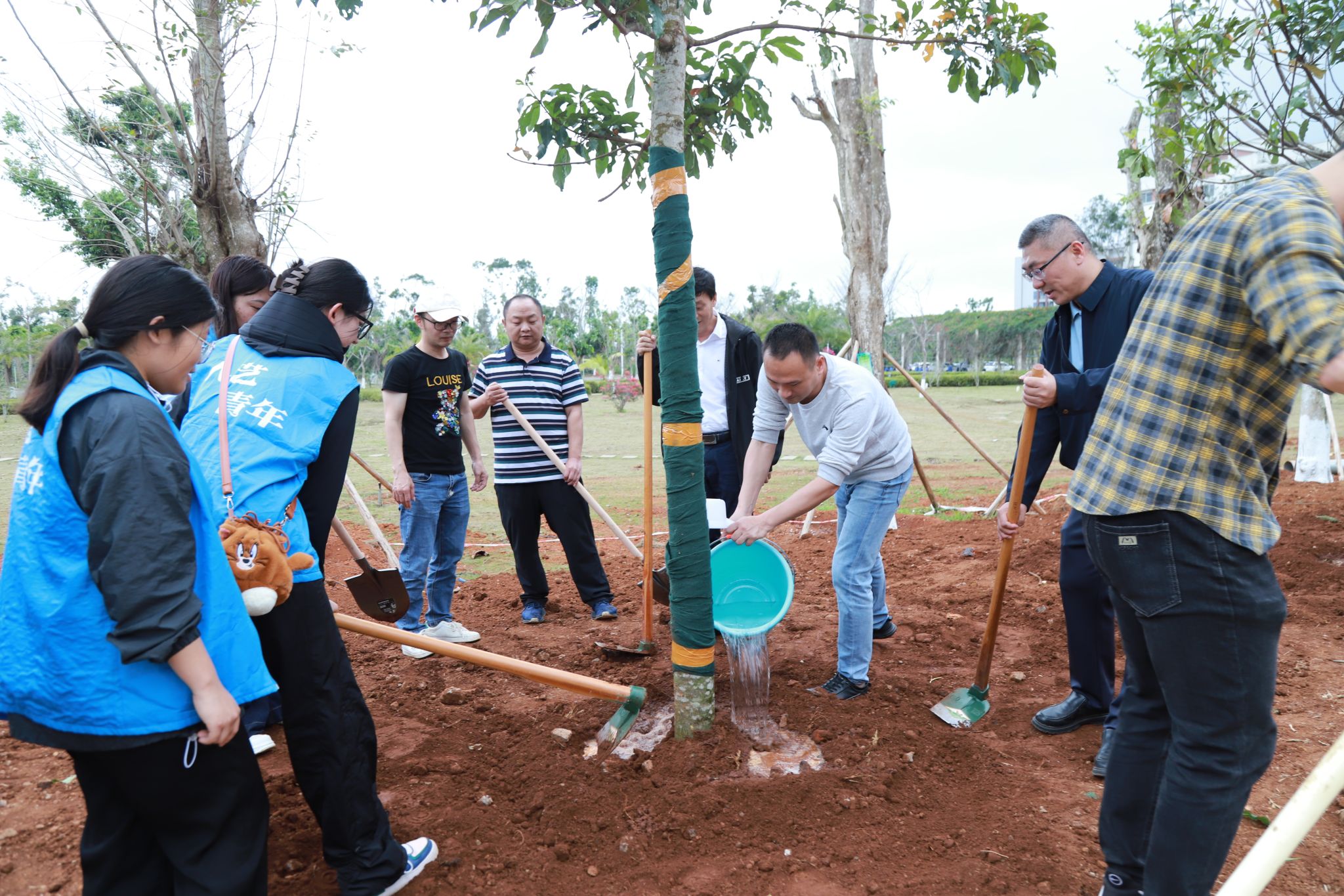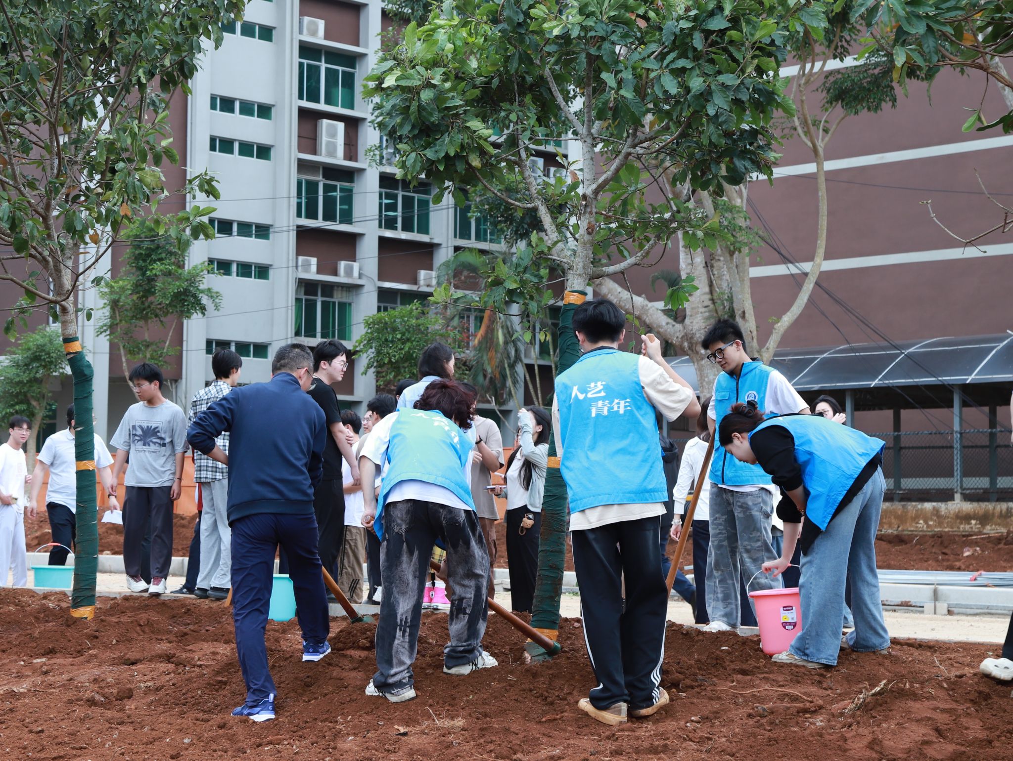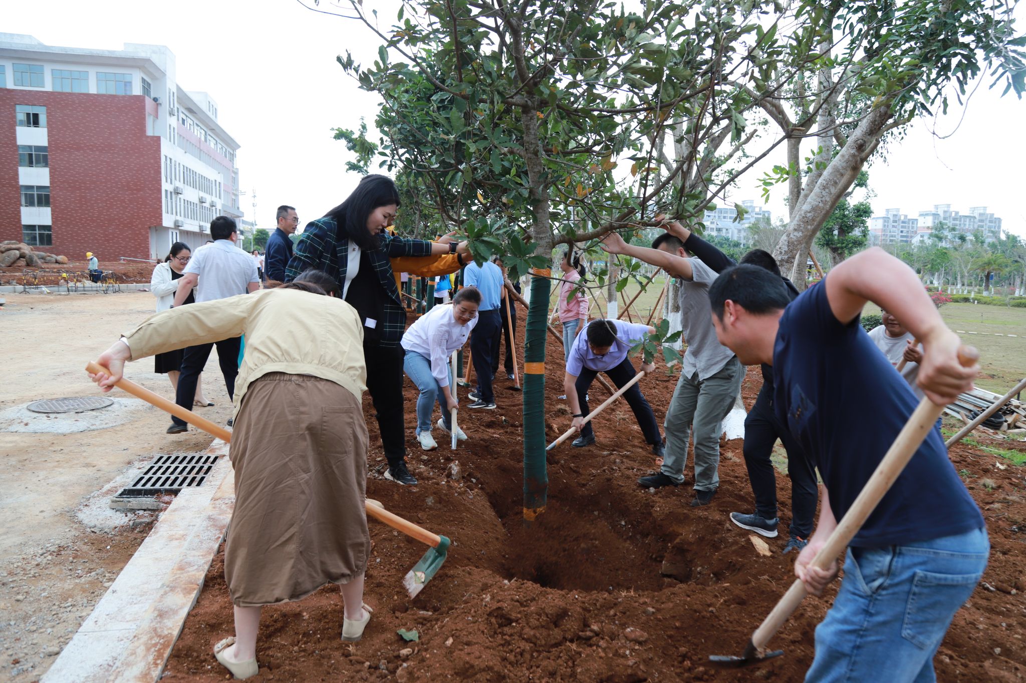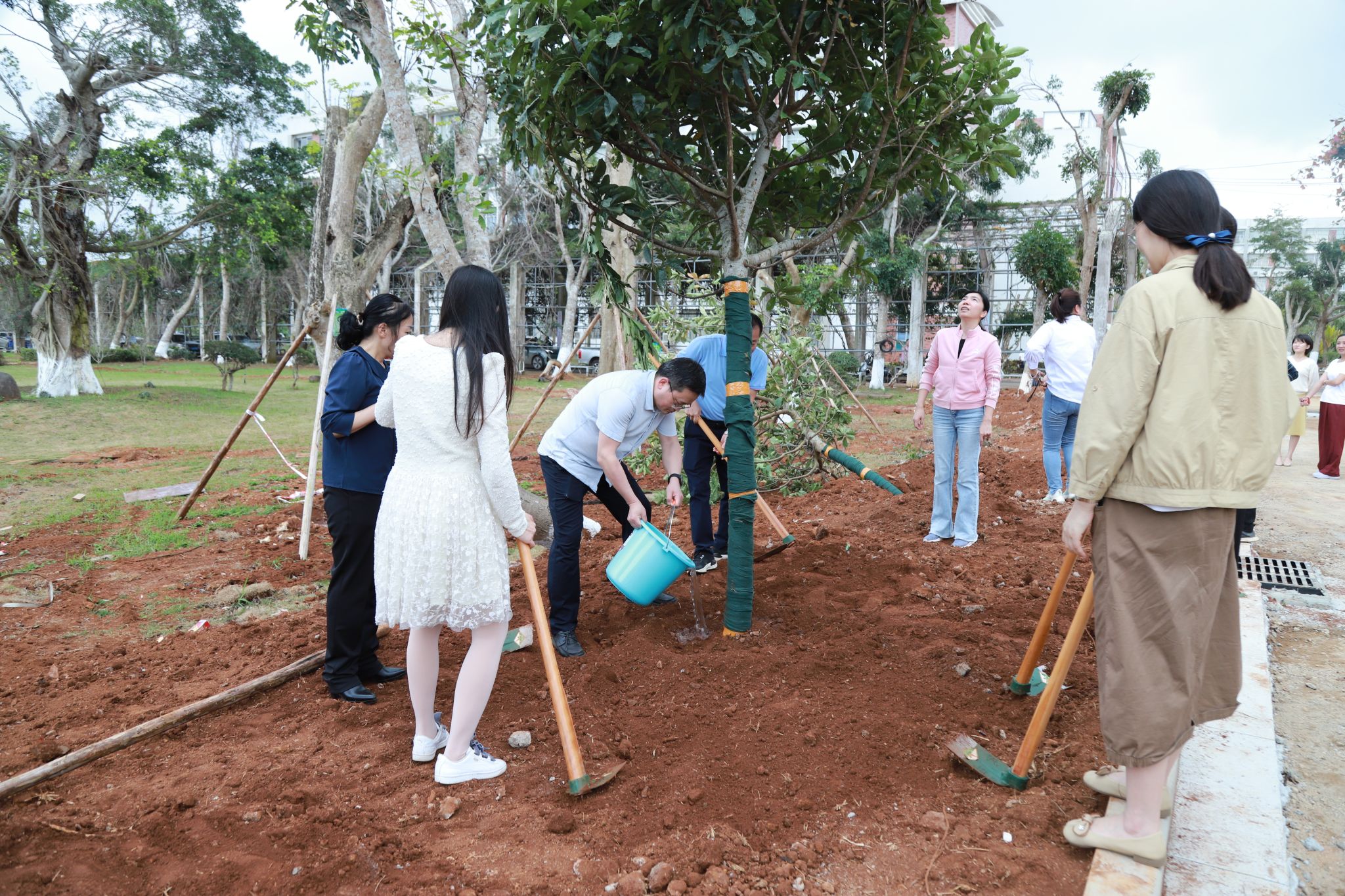 在教学区域新建道路旁,大家齐心协力、各司其职,挥锹铲土、堆起围堰、提桶浇水,十余棵玉蕊树深深扎根于土壤之中,迎风挺立,生机盎然。“大家要记得哪颗树是自己亲自种下的,要经常来看看树木长得怎么样啊!”植树现场气氛火热,回荡着欢声笑语。