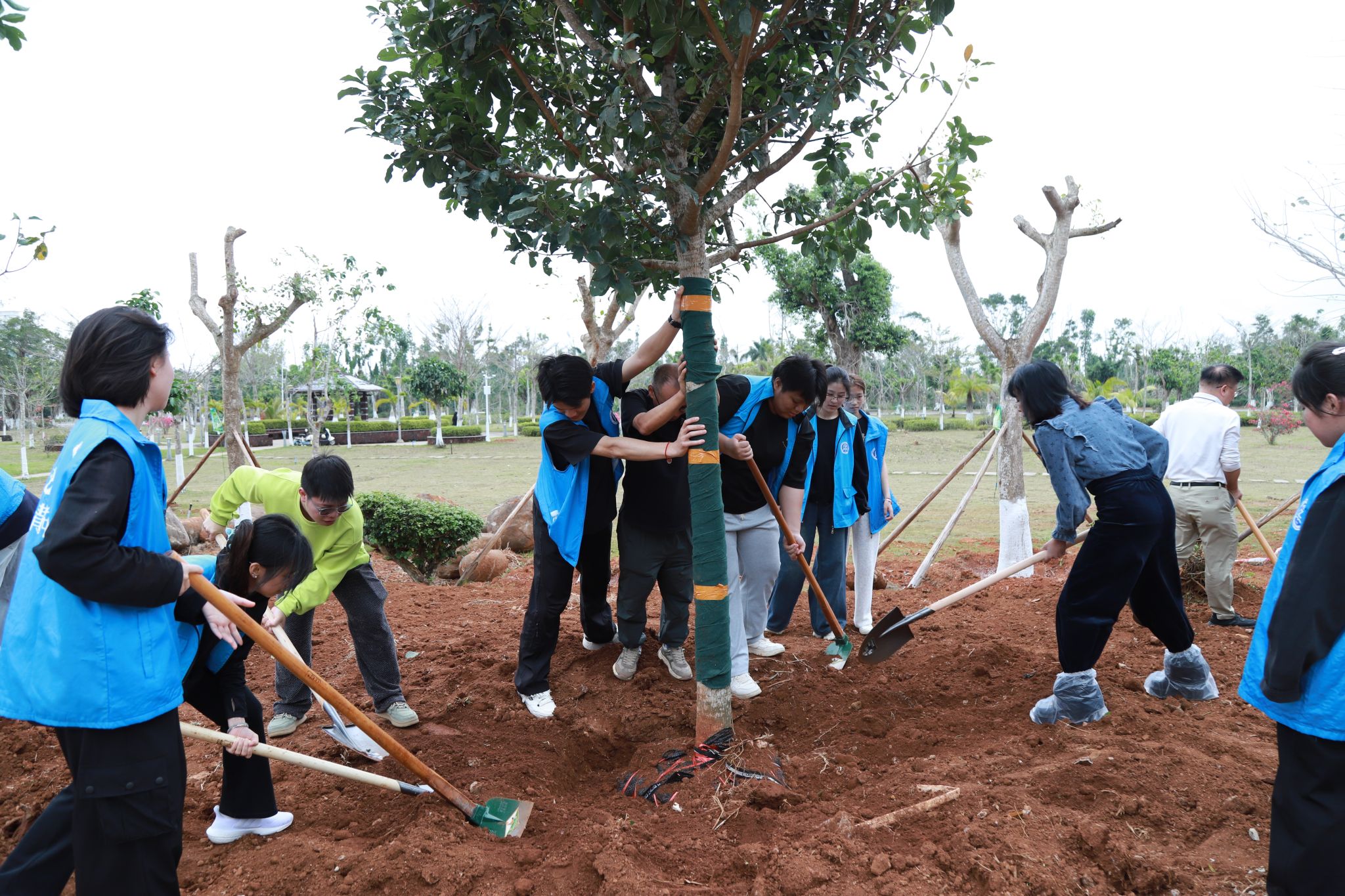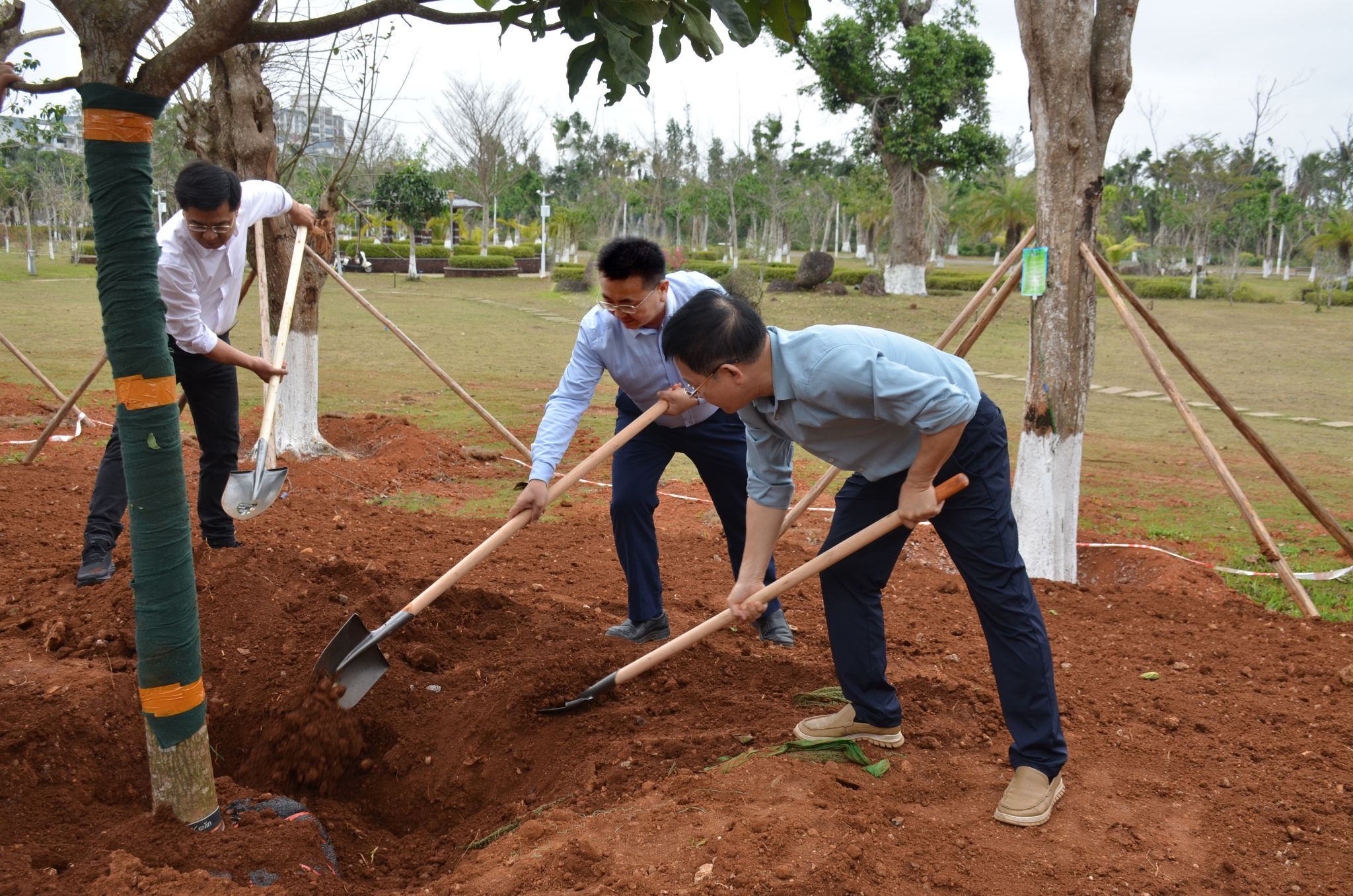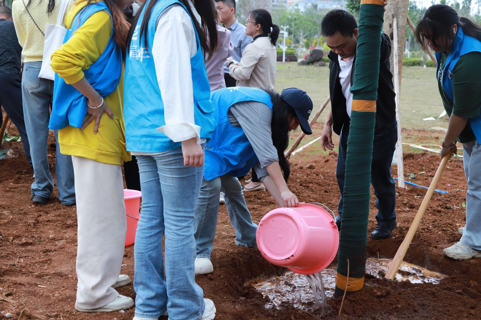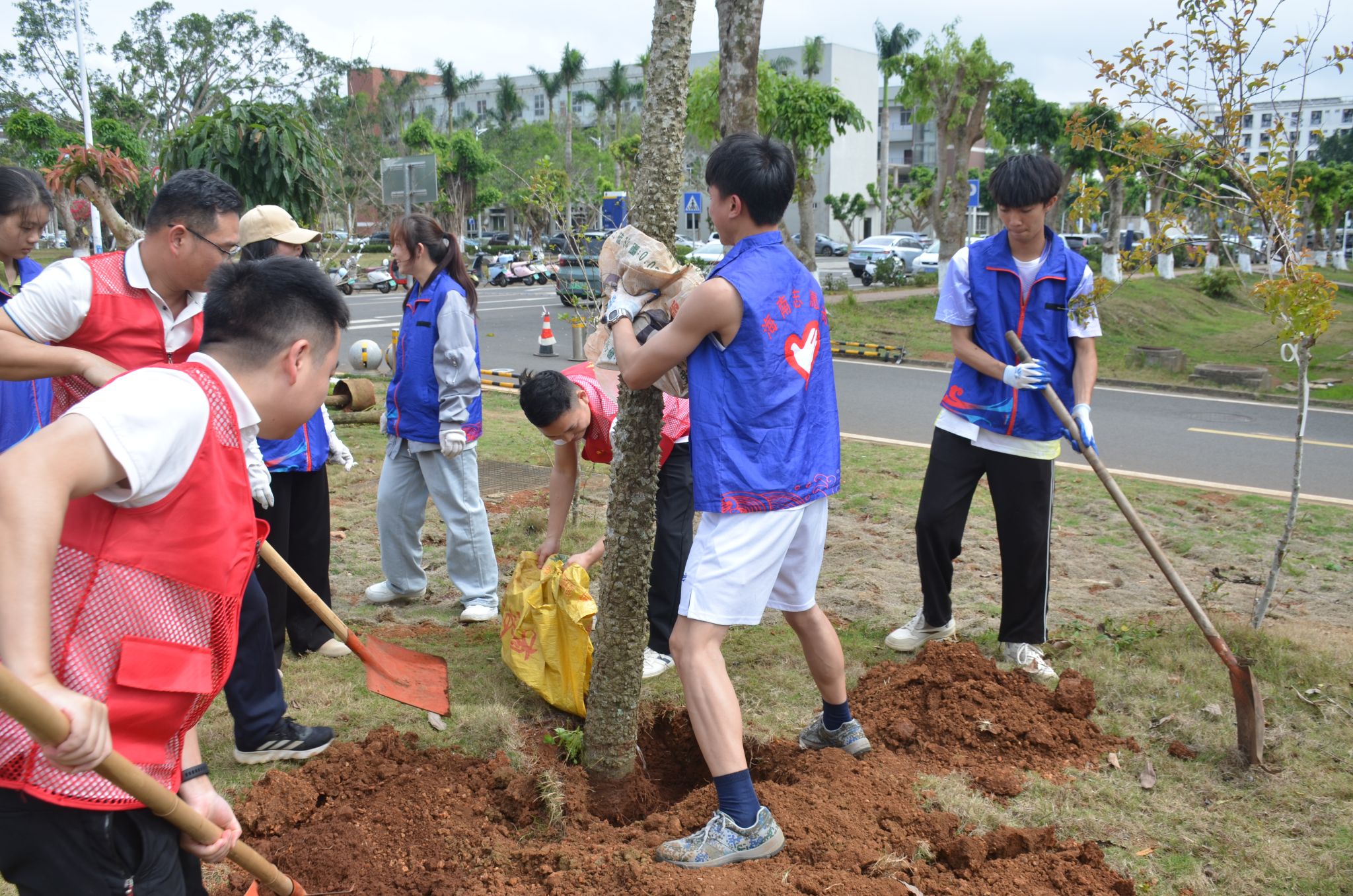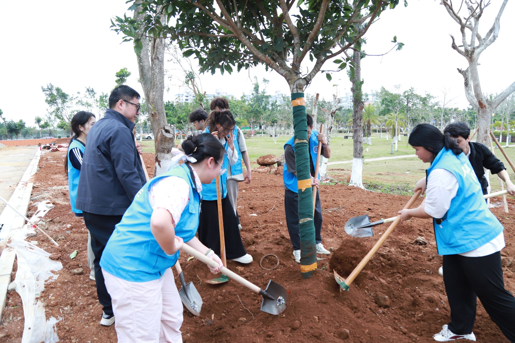 在教学区域新建道路旁,大家齐心协力、各司其职,挥锹铲土、堆起围堰、提桶浇水,十余棵玉蕊树深深扎根于土壤之中,迎风挺立,生机盎然。“大家要记得哪颗树是自己亲自种下的,要经常来看看树木长得怎么样啊!”植树现场气氛火热,回荡着欢声笑语。