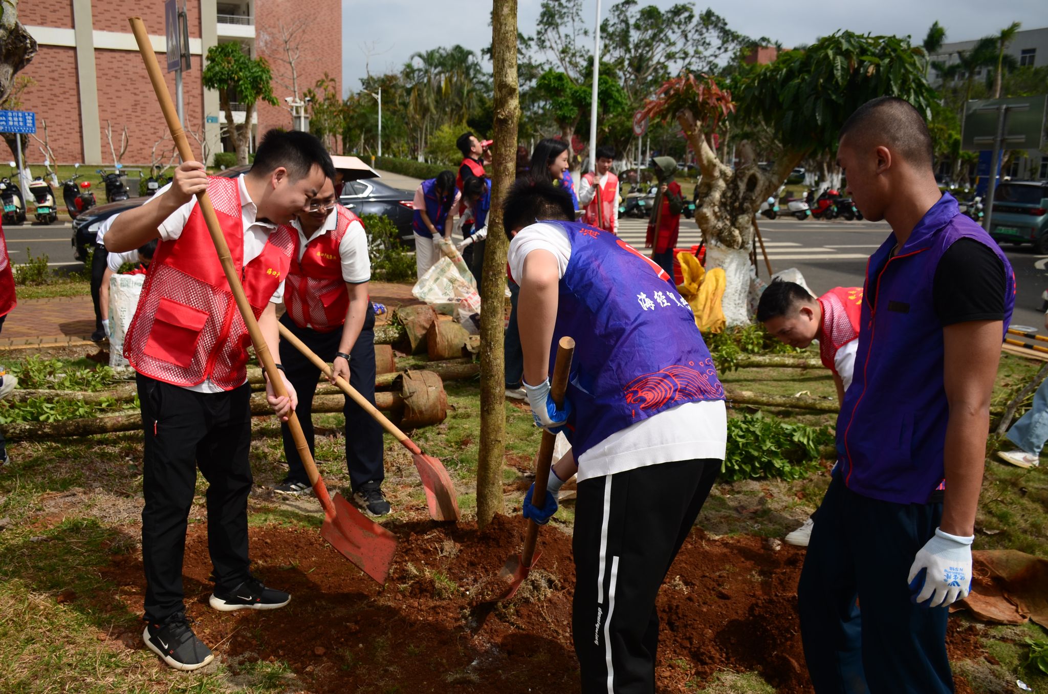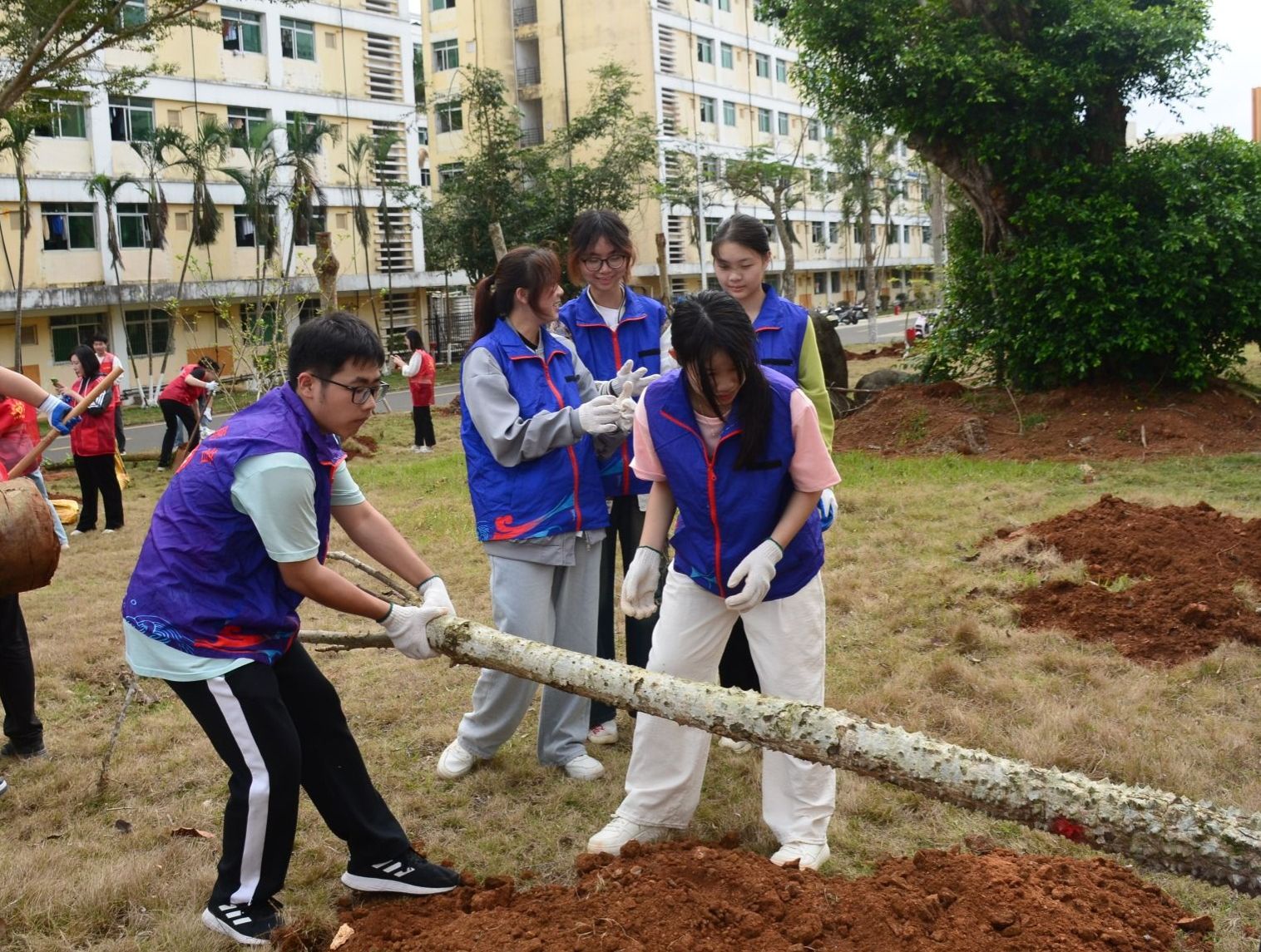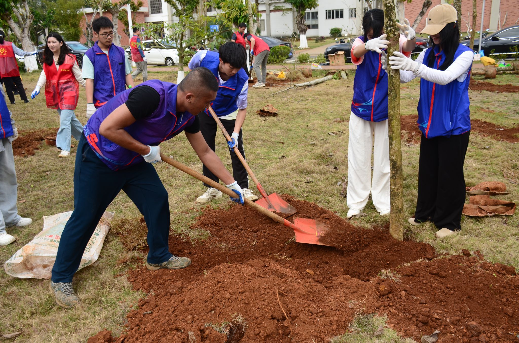 八栋学生宿舍前,学生志愿者们将30棵重阳木和木棉的树苗种下,以实际行动为绿化美化建设注入青春动能。一棵棵幼苗在春日暖阳中整齐列队,与志愿者们的红色马甲相映成趣,为校园增添了盎然生机。看着自己亲手种下的树苗,大家感到十分自豪和满足,期待着这些树木在校园里茁壮成长,成为校园里一道亮丽的风景线。
