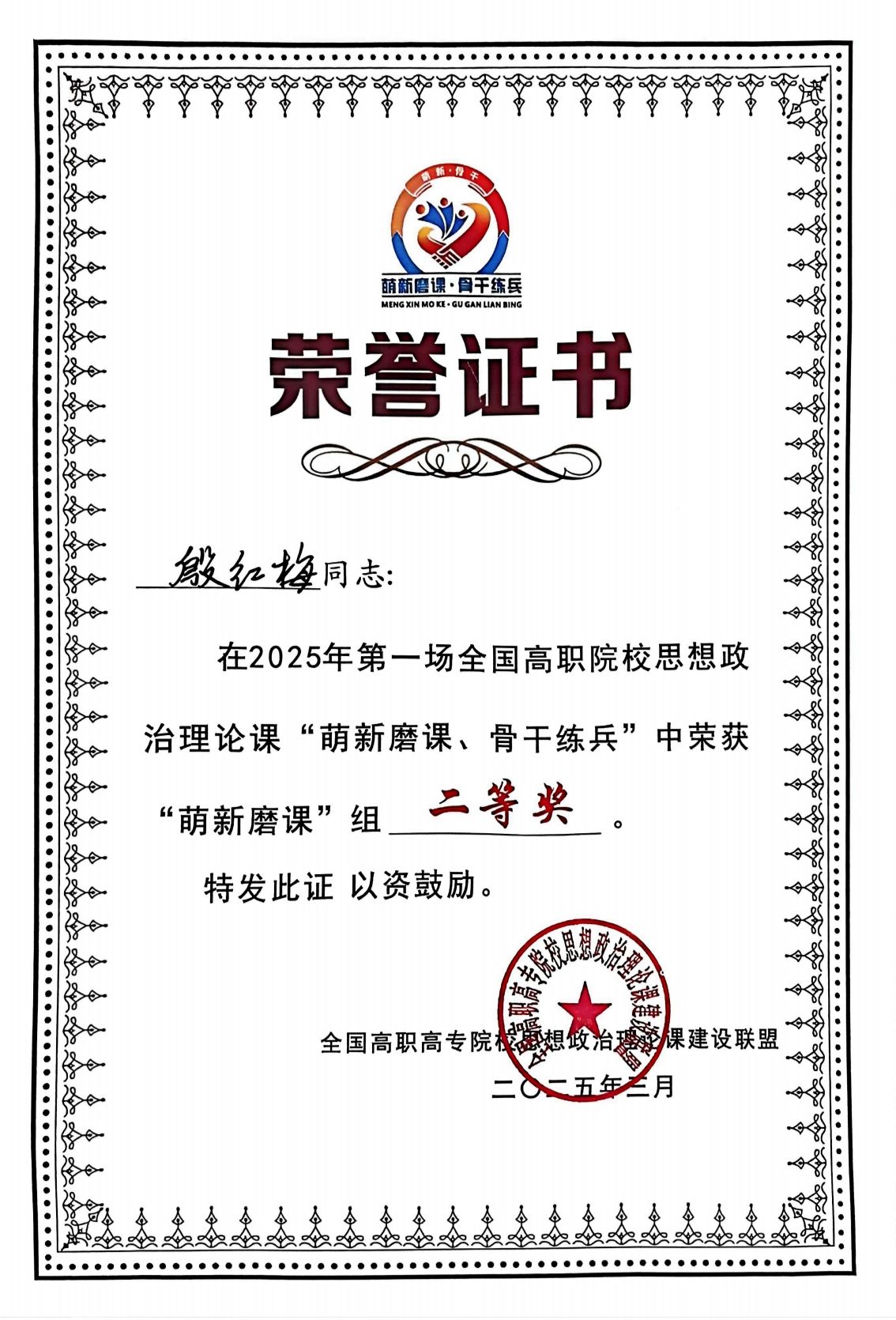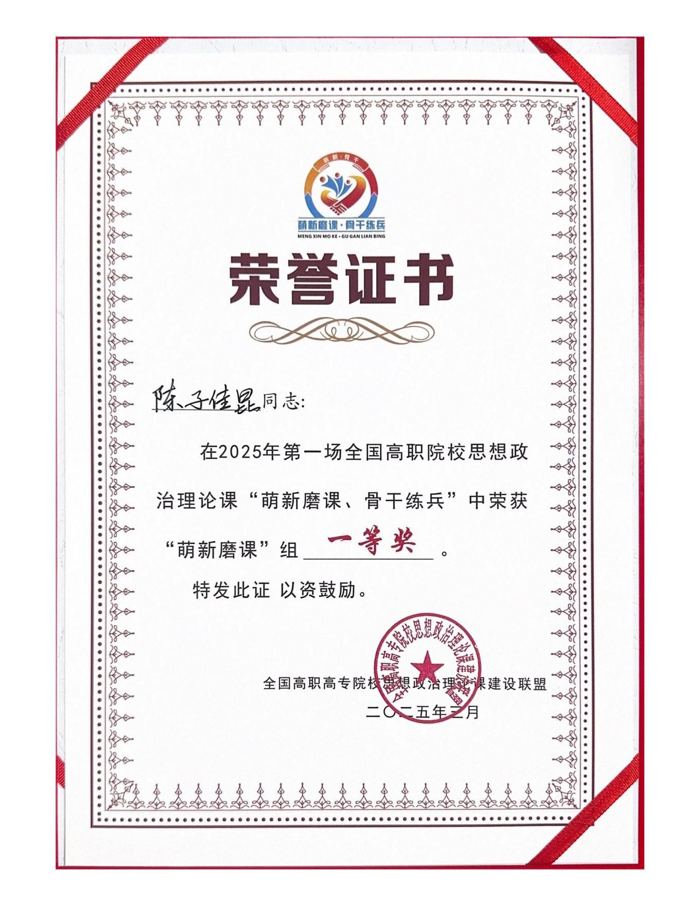3月29日,2025年全国高职院校思想政治理论课第一场“萌新磨课、骨干练兵”教学展示活动在南宁圆满落幕。kaiyun登录中国入口登录陈子佳昆老师获得“萌新磨课”组一等奖,殷红梅老师获得二等奖。