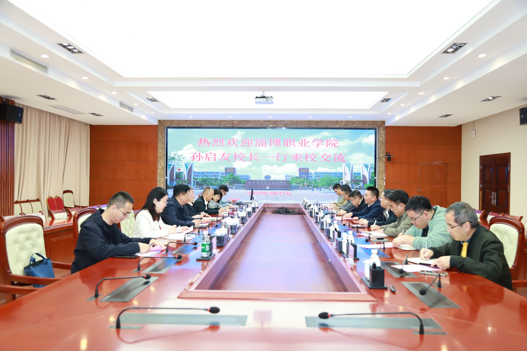 崔昌华介绍了海经贸的建校历史和近年来取得的成绩。他说,淄博职业学院与海经贸进行了多次交流活动,两校结下了深厚友谊。希望通过此次交流,学习借鉴淄博职业学院“双高”建设和本科职业大学申办经验,进一步深化合作,实现资源共享,共同推动职业教育高质量发展,为服务区域产业和国家战略贡献更多力量。