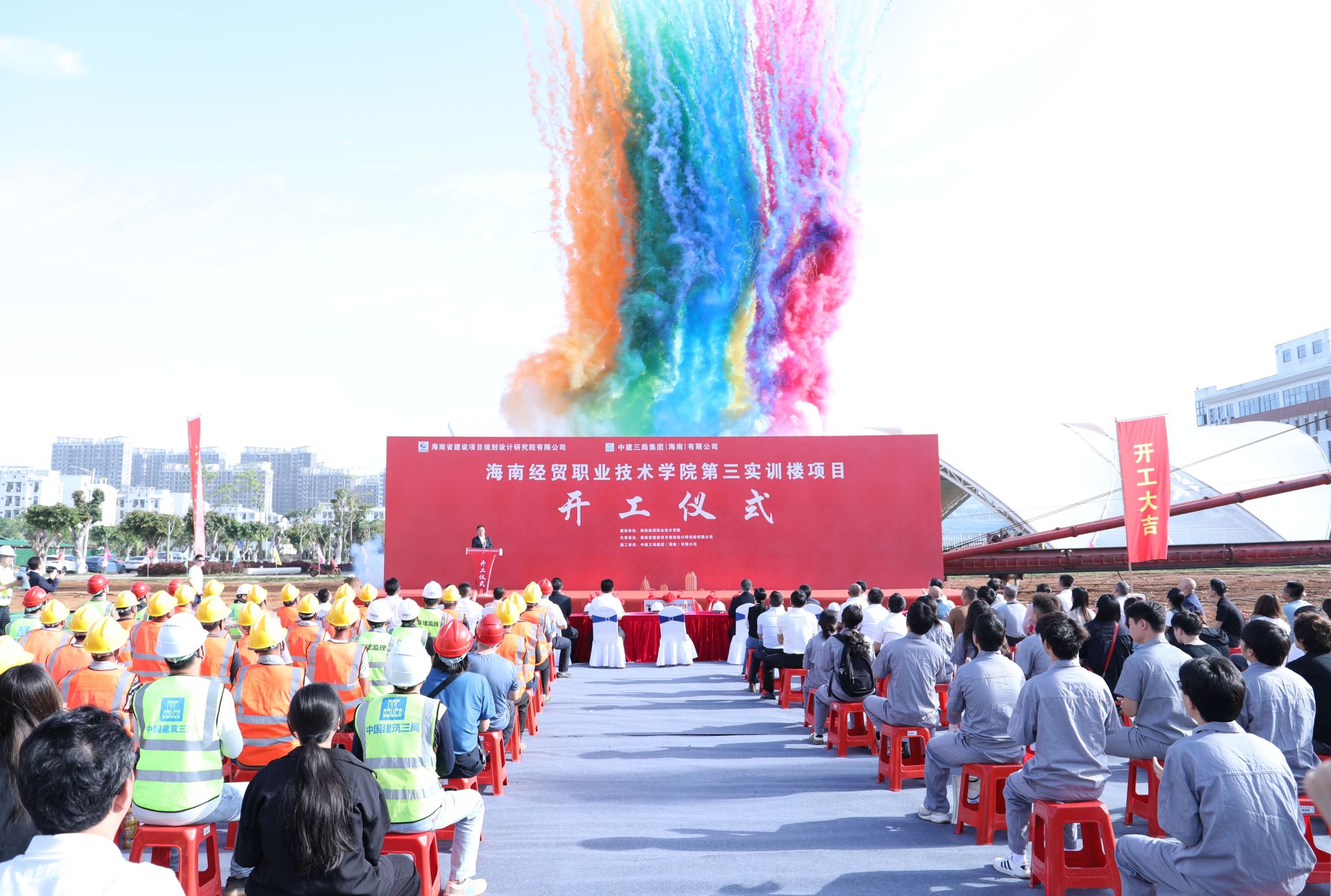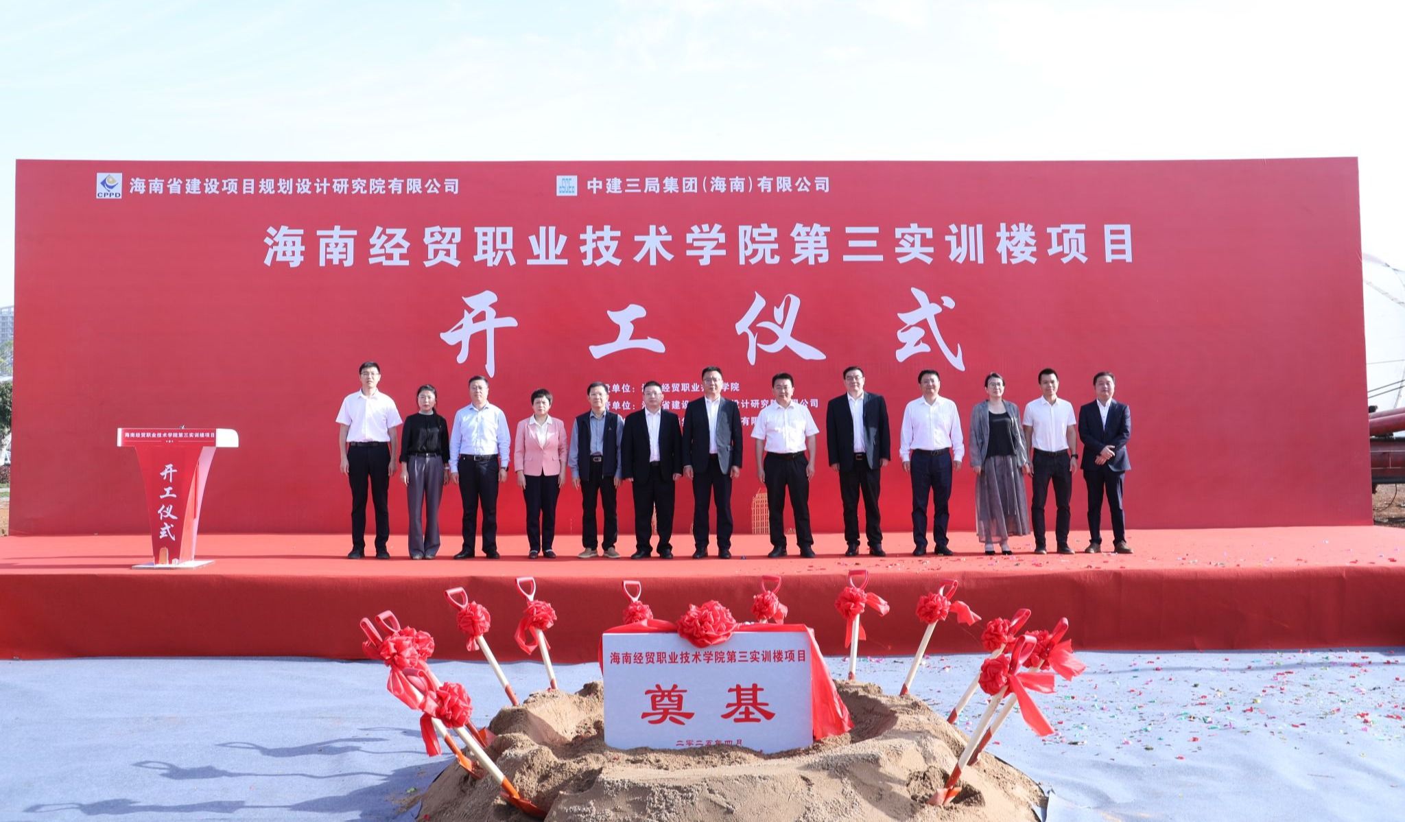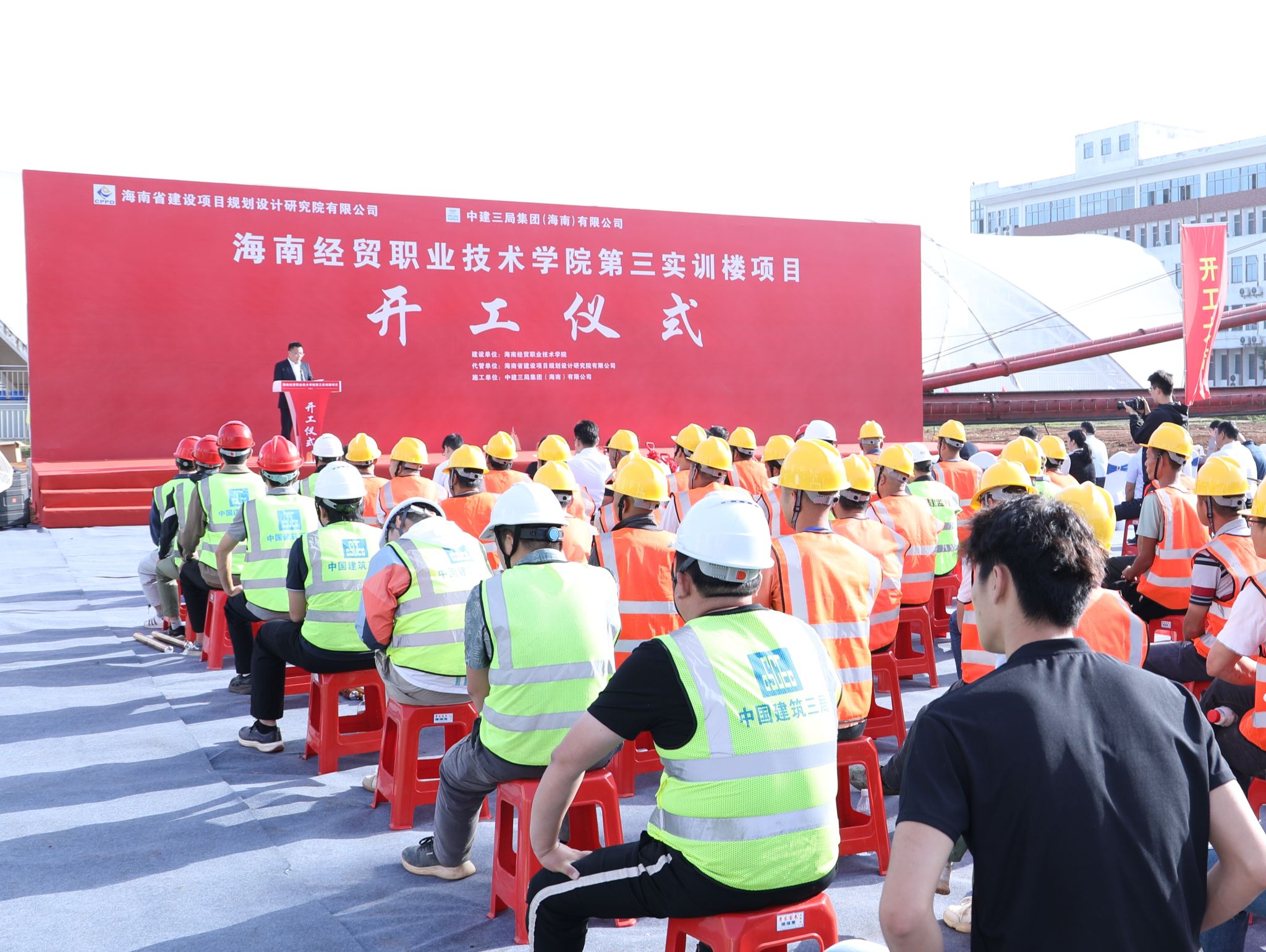 海南省建设项目规划设计研究院有限公司党委副书记陈志刚,海南华建工程监理咨询有限公司总经理邝继府,中建三局集团(海南)有限公司党委副书记、总经理彭云涛分别发言。