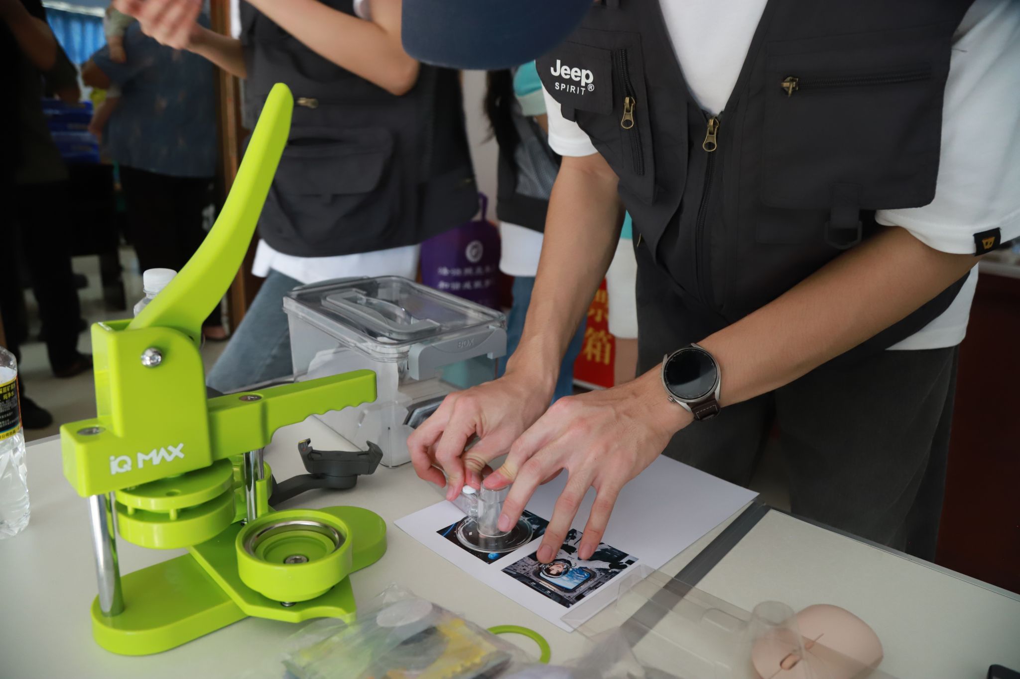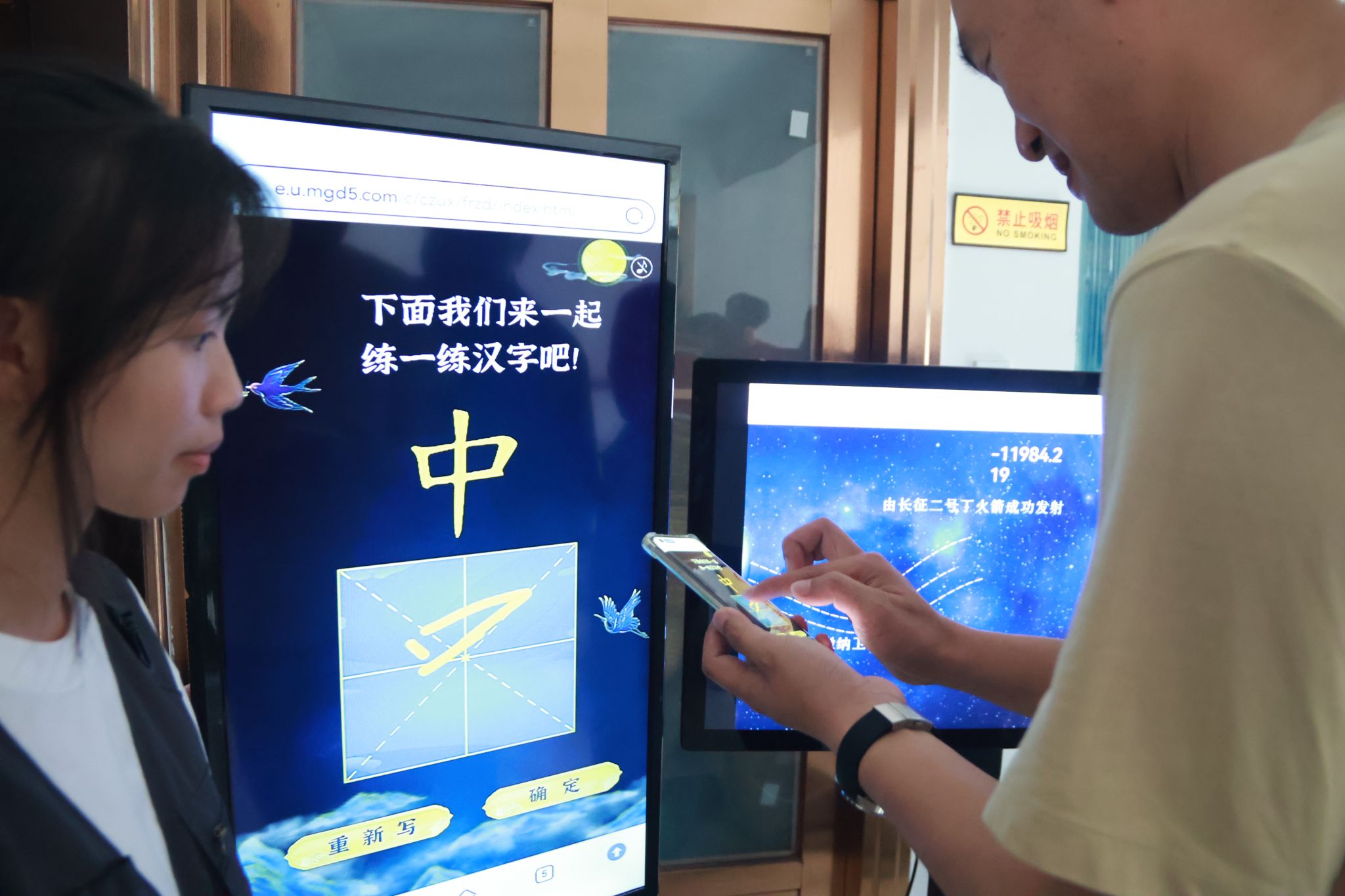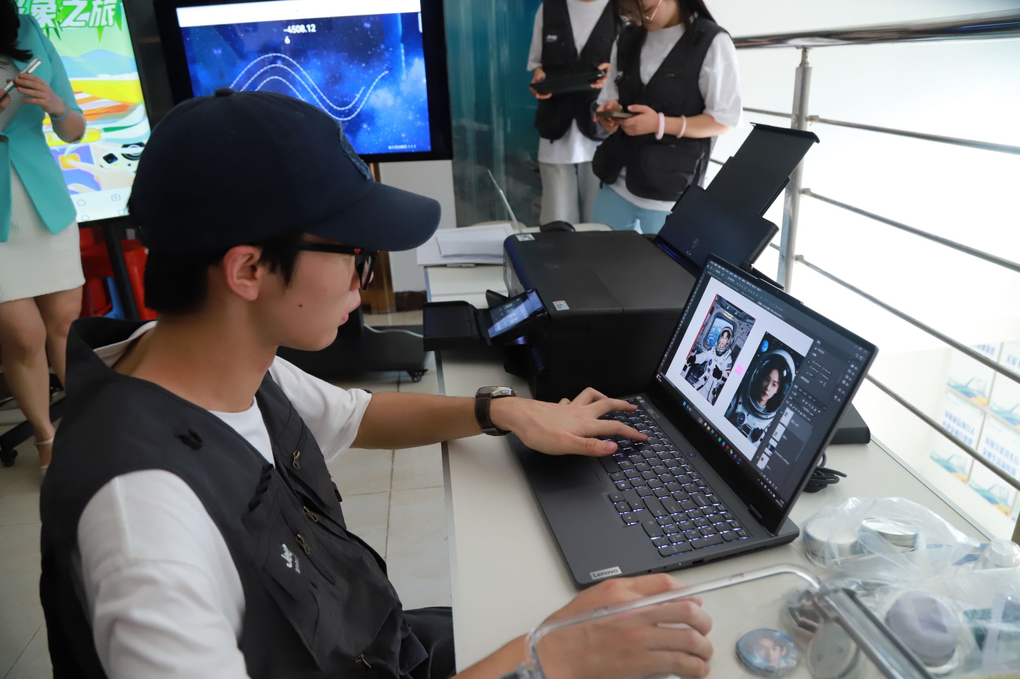 “拍摄人像上传系统,通过AI技术生成航天员形象照,打印后可以形成自己的专属徽章哦~”人文艺术学院师生以“智能触控屏+交互式H5”为载体,生动展示融媒体技术在内容传播与用户交互领域的创新应用,让社区居民亲身感受“技术赋能创意”的无限可能。从指尖触碰屏幕的瞬间到创意内容实时生成,技术带来的便捷与创意迸发的惊喜引发居民们的阵阵赞叹。