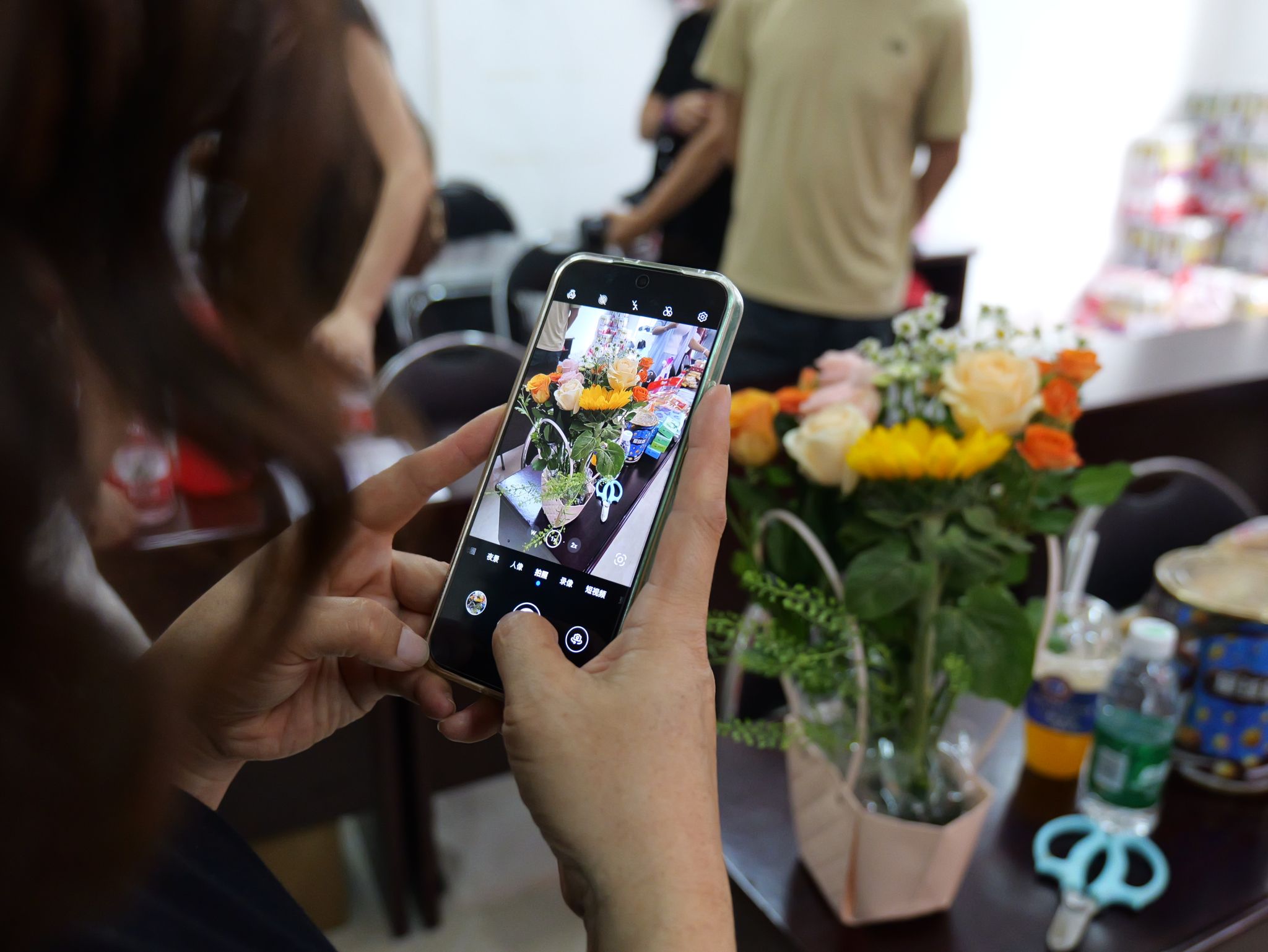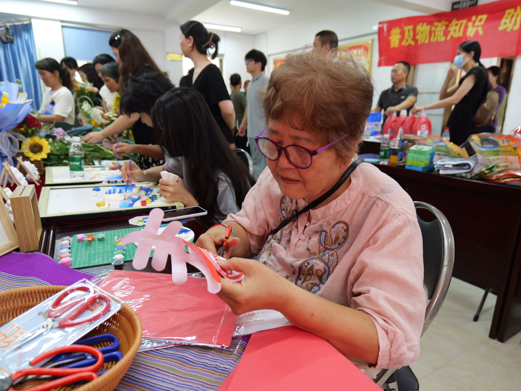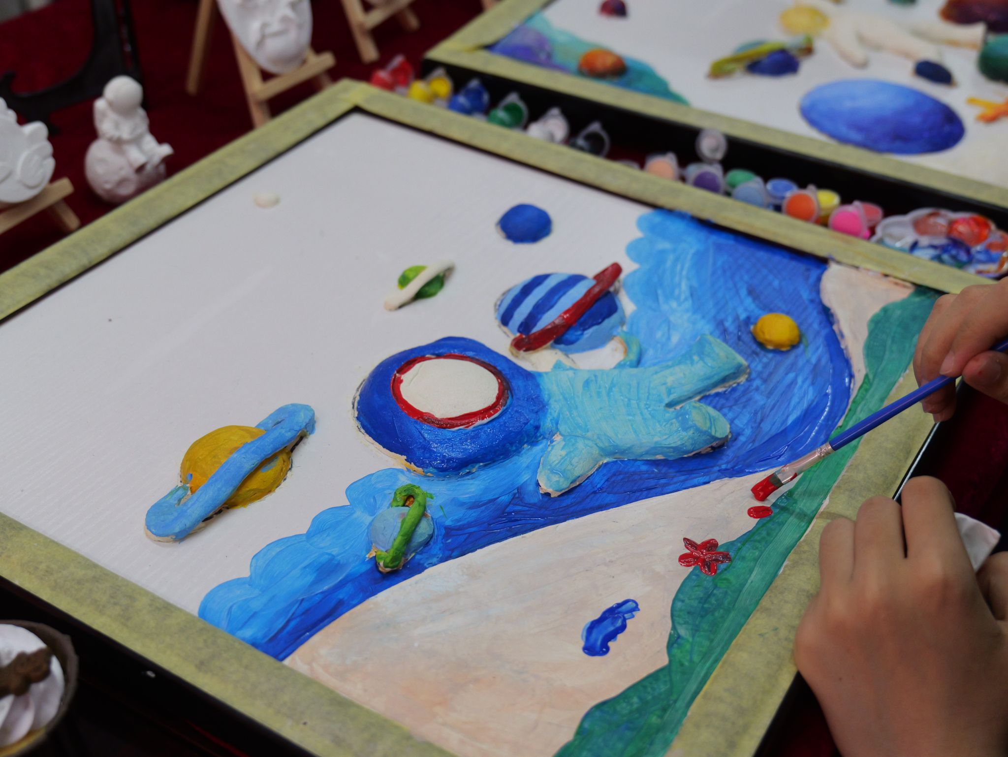 灰塑融合航天元素,悉心精致描画;干花点缀扇面,配色别致精美;花艺剪纸国风满满,心意创意无限……人文艺术学院郭欣宇等同学把专业技能和对生活的热爱传递给社区居民朋友们。大家在这里欣赏美、感受美、创造美。