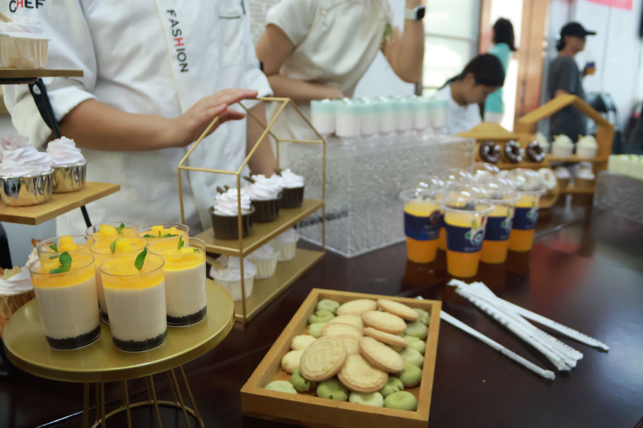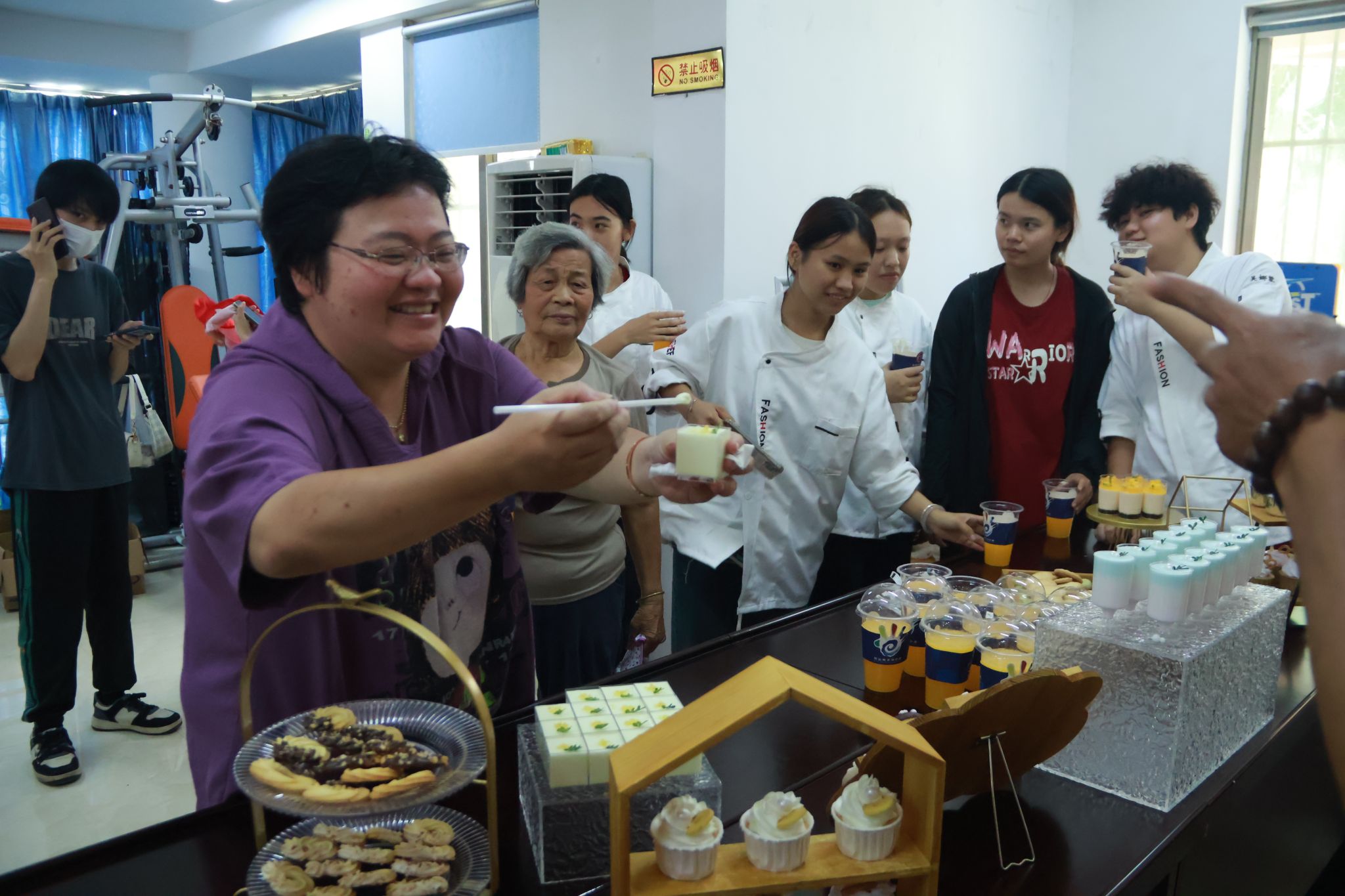 纸杯蛋糕、芒果慕斯、马卡龙慕斯、印模饼干、甜甜圈……国际旅游学院同学们制作了精致美味的茶点。“味道真不错啊,都是你们亲手做的吗?”居民朋友们对同学们的作品表示欣赏,也为大家的职业技能点赞。