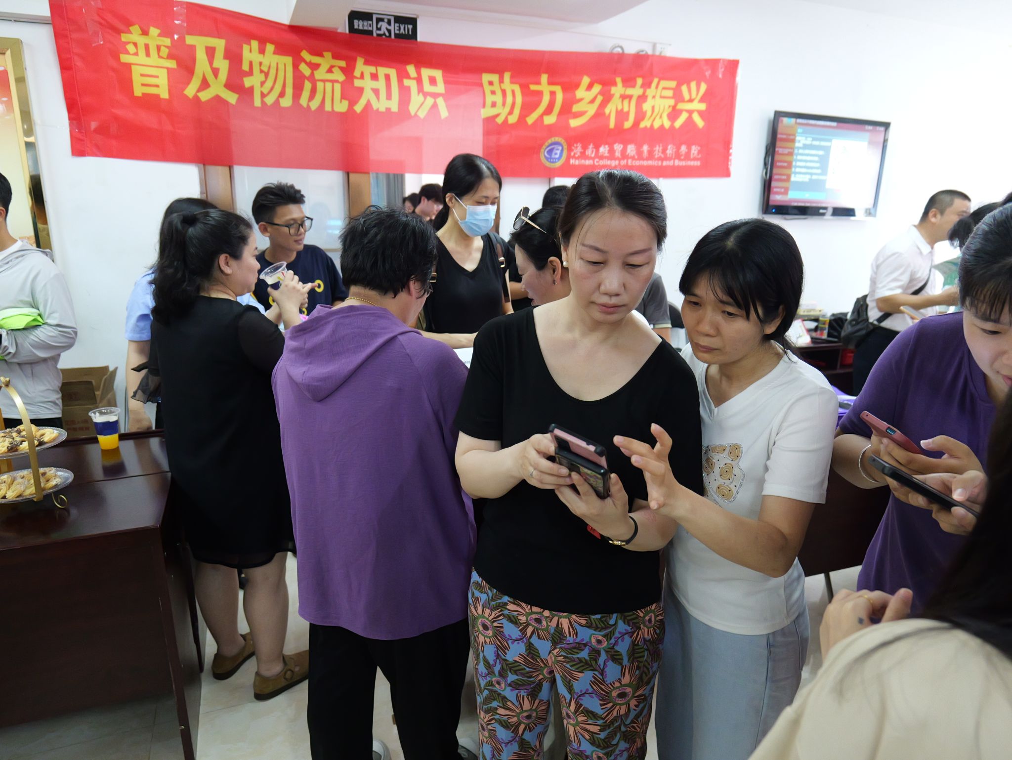 “大家要抵制离岛免税‘套代购’行为。” “您可以扫码参与答题,领取奖品!”“网购衣服尺码不对时,我们要怎么处理呢?”国际贸易学院设置了海南自贸港物流知识普及问答互动,主要涵盖日常生活相关的物流法律、电商知识等内容。居民们热情参与答题,了解相关知识。