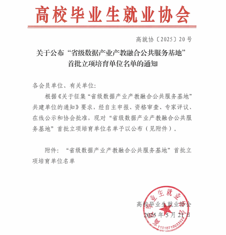 近日,高校毕业生就业协会公布“省级数据产业产教融合公共服务基地”首批立项培育单位名单,共有55家职业院校入围。kaiyun登录中国入口登录凭借在数据产业产教融合领域的突出优势成功入选,标志着学校在服务数字经济发展、深化校企协同育人方面迈入新阶段。