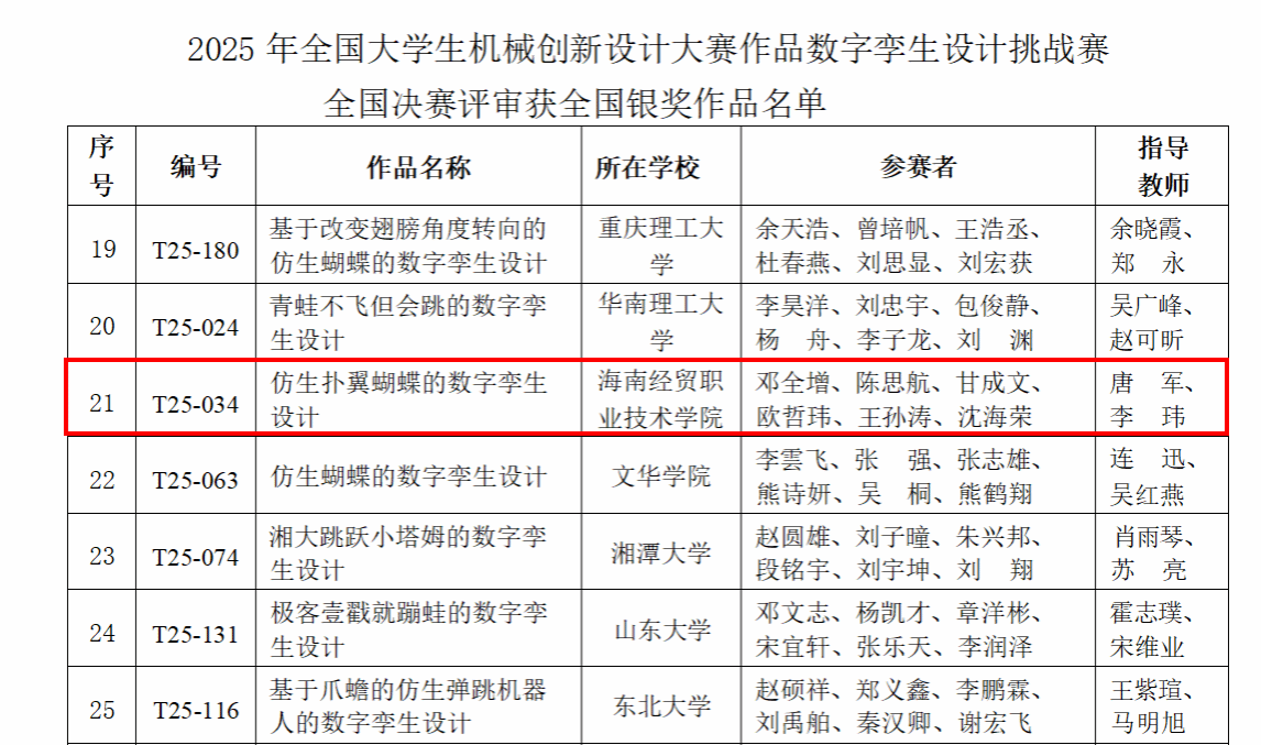 近日,全国大学生机械创新设计大赛作品数字孪生设计挑战赛(以下简称挑战赛)全国决赛圆满落幕。kaiyun登录中国入口登录机电与汽车工程学院参赛队伍表现出色,历经全国初选、初赛突围、复赛晋级、决赛争锋四个阶段的激烈角逐,以作品“仿生扑翼蝴蝶的数字孪生设计”荣获银奖。