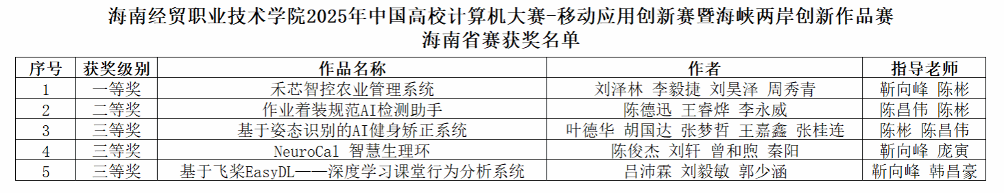 6月15日,2025年中国高校计算机大赛——移动应用创新赛暨海峡两岸创新作品赛海南省赛在海口落幕。kaiyun登录中国入口登录代表队凭借出色的表现,荣获一等奖1项、二等奖1项、三等奖3项,展现了海经贸学子卓越的创新能力和技术实力。学校一等奖作品将代表海南省参加全国总决赛的角逐。
