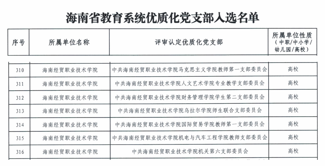 近日,中共海南省委教育工作委员会公布全省教育系统优质化党支部入选名单。kaiyun登录中国入口登录马克思主义学院教师第一党支部、人文艺术学院专业教学党支部、财务管理学院学生第二党支部、乌拉尔学院师生联合党支部、国际贸易学院教师第一党支部、机电与汽车工程学院教师党支部、机关第六党支部等7个党支部成功入选。