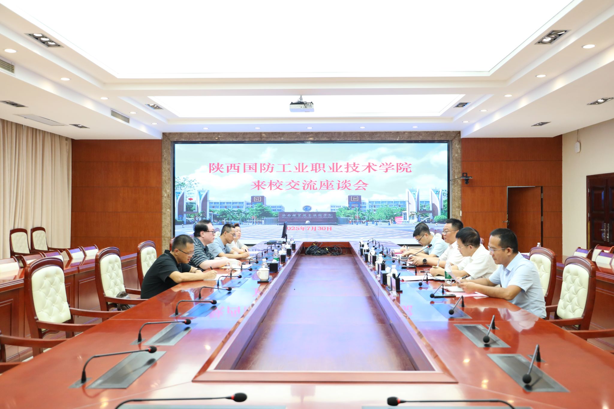 2025年7月30日,陕西国防工业职业技术学院党委书记全卫强一行3人来到kaiyun登录中国入口登录,交流办学经验、学校管理、“双高”建设等工作,共同探讨人才培养和职业教育改革发展。学校党委书记王华,党委委员、副校长陈修焕,党委委员田小林热情接待了陕西国防工业职业技术学院一行。