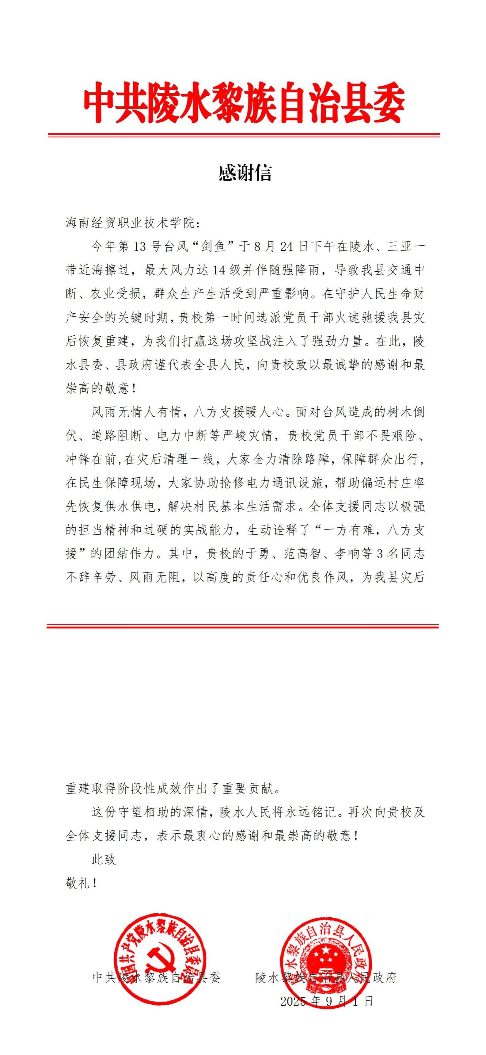 2025年9月1日,中共陵水黎族自治县委、陵水黎族自治县人民政府向学校发来感谢信,对于勇、范高智、李响等3名党员干部在台风“剑鱼”灾后恢复重建中火速驰援该县表示诚挚谢意。