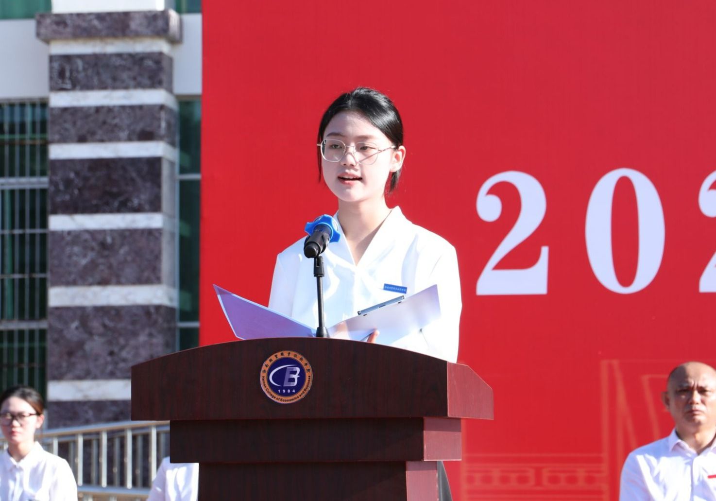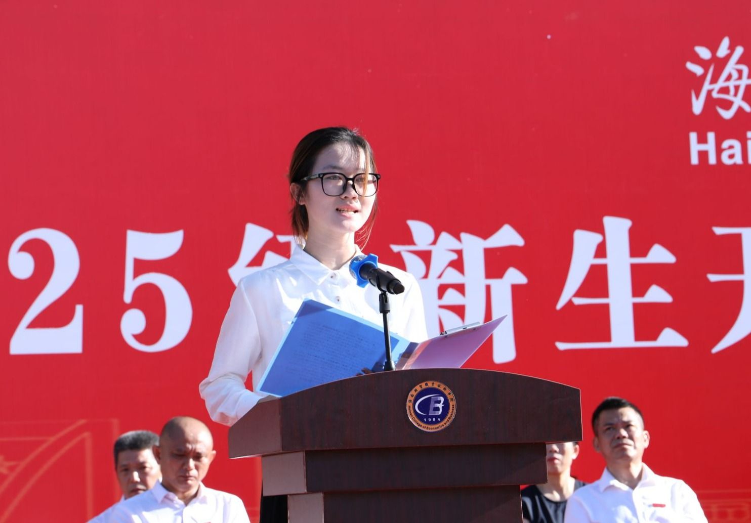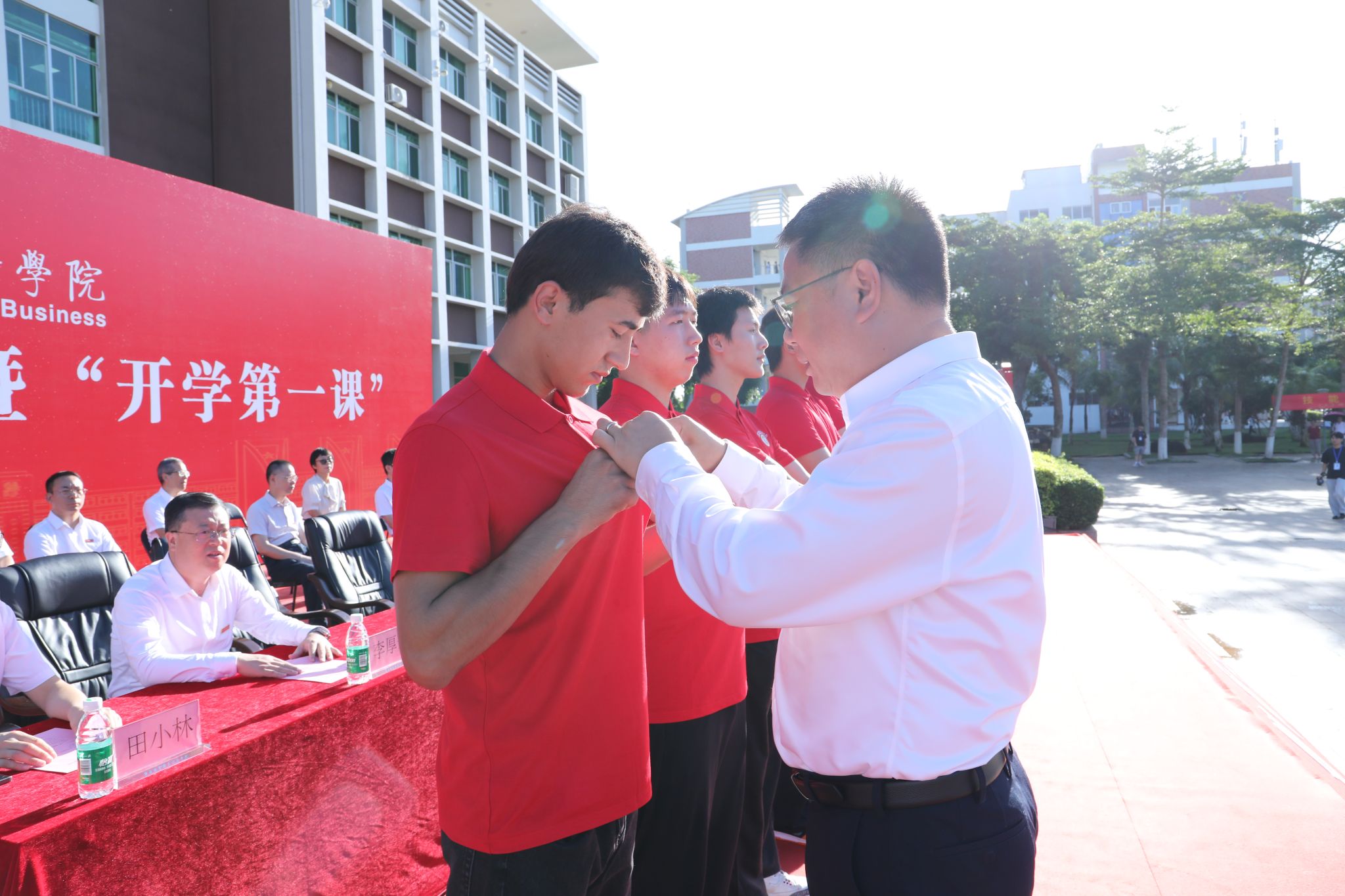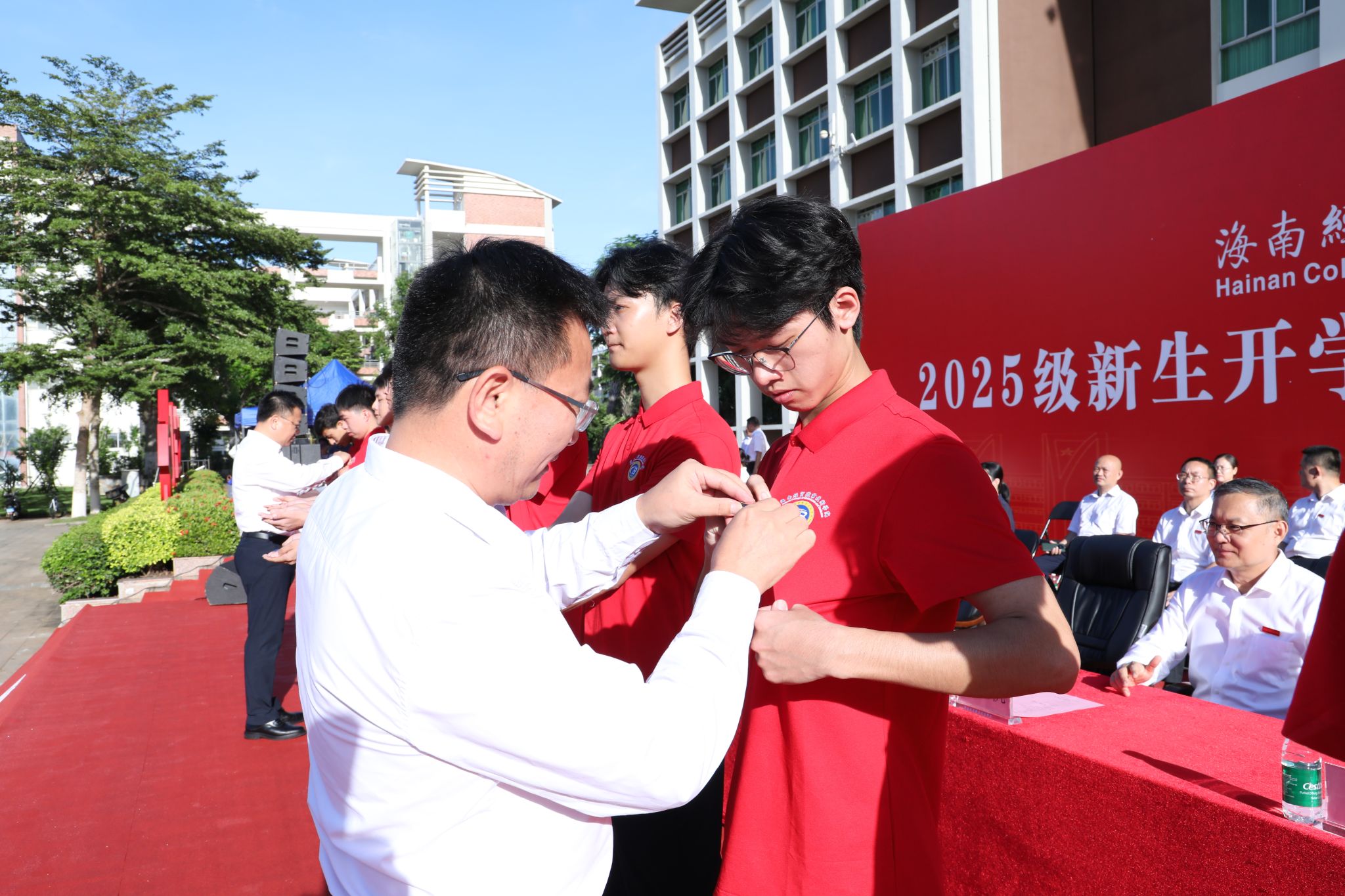 在庄严的国歌声中,开学典礼正式开始。王华、崔昌华为新生代表佩戴学校徽章。台下全体新生起立,同步佩戴学校徽章。蓝色的金属徽章映着朝阳泛起细碎的光,在这一刻,新同学们与海经贸的联结被郑重镌刻,人生旅程从此和学校紧紧相融,开启崭新的斑斓篇章。