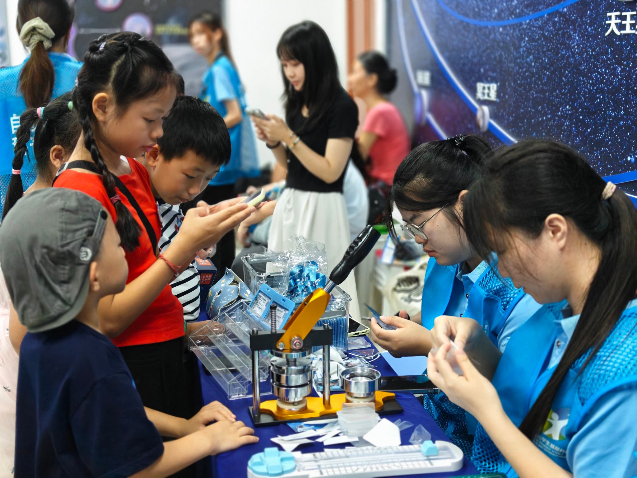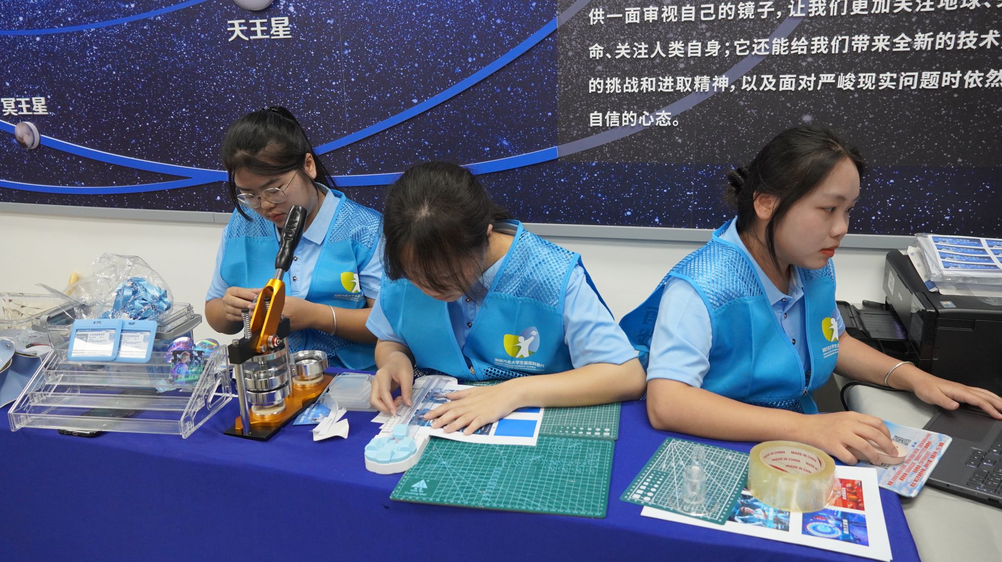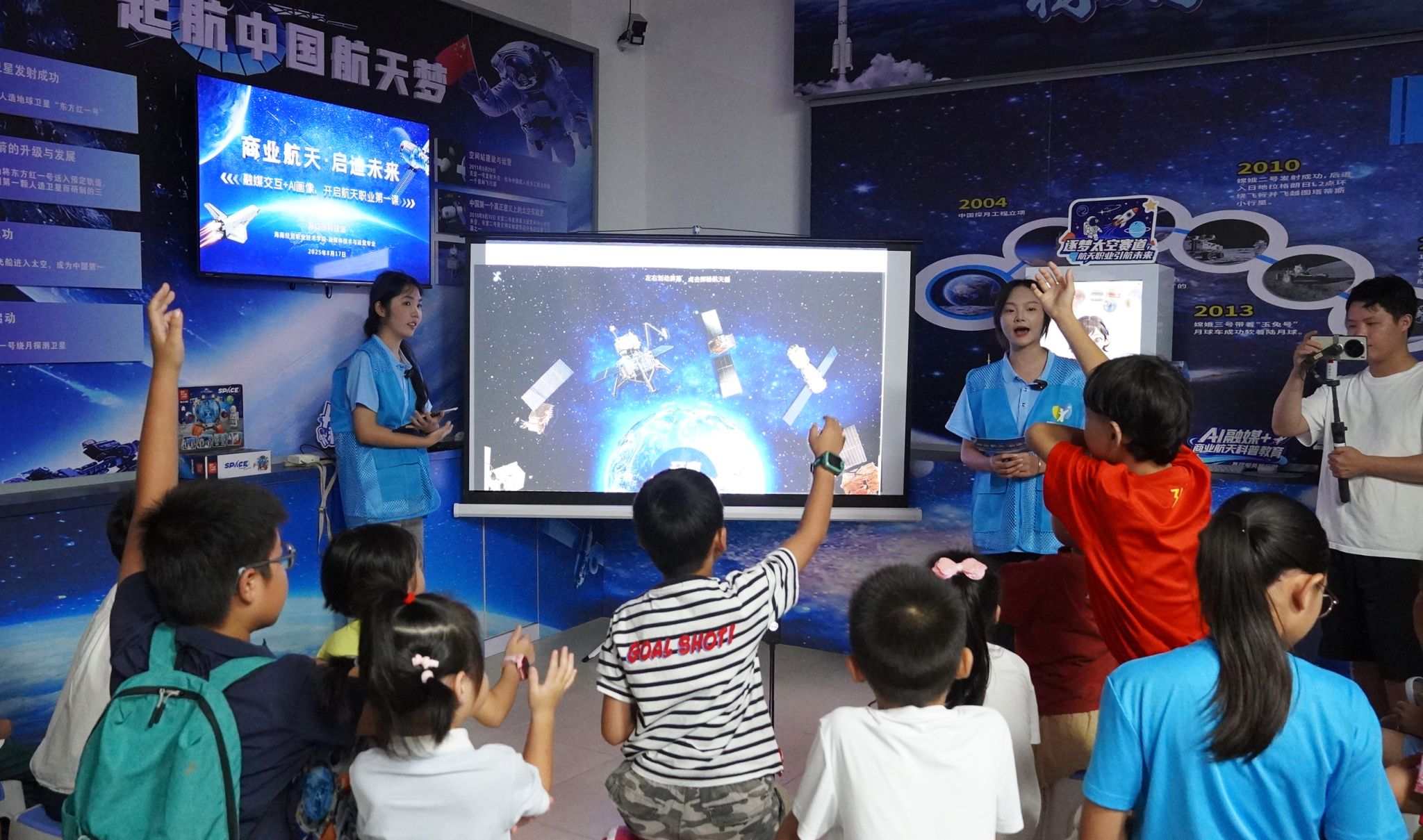 融媒赋能航天科普,点燃青少年科学梦想。团队成员联合海口市科技馆开展航天职业体验活动,让孩子们了解商业航天的发展历程和航天器知识,参与职业思维倾向测试,生成AI融合航天职业画像,并制作成专属个人形象徽章、冰箱贴,让高端科技可知可感可留念。