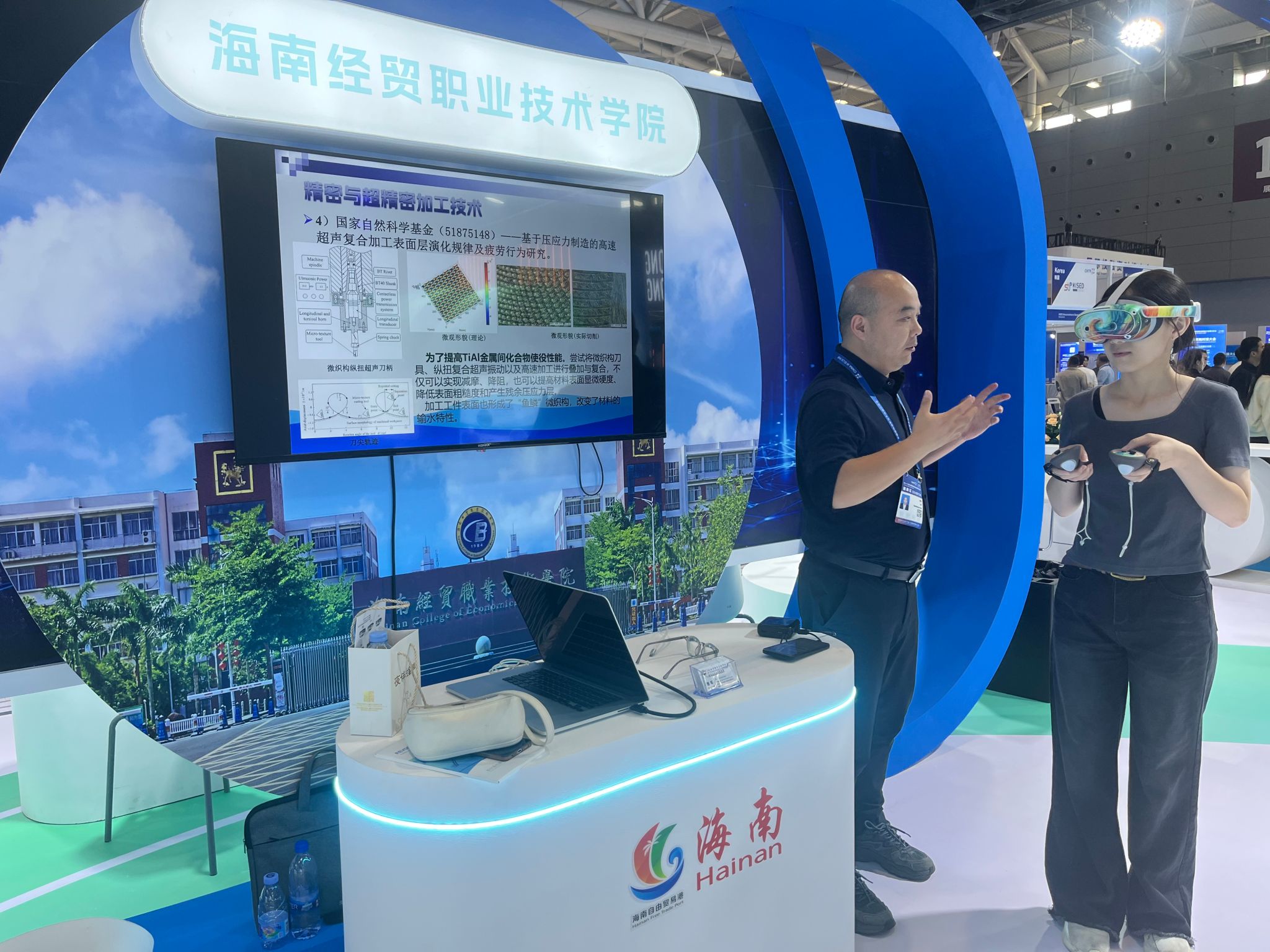 其中,由海经贸“智能海洋装备与先进制造技术创新团队”自主研发的VR数字孪生系统,将车床、铣床、钻床、磨床、镗床及多轴加工中心等先进设备进行高精度数字化映射,构建出完整的虚拟工厂环境。该系统不仅实现物理设备与虚拟模型的实时同步与交互,更以直观、沉浸的交互体验吸引众多观众驻足互动,成为展会现场最具人气的展示项目之一。