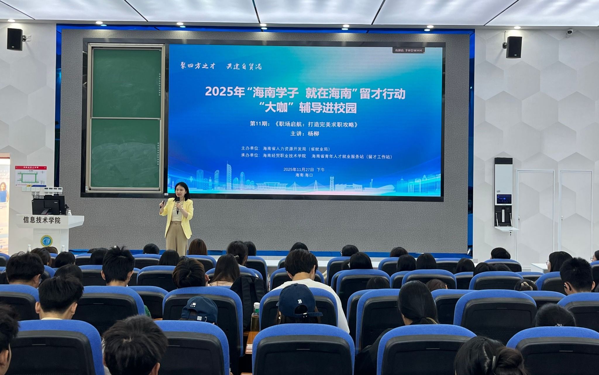 杨柳围绕“职业雷达・精准锁定机会”“简历模板・15秒抓住HR眼球”“面试实战・通关全场景考核”三大核心模块展开培训。她深入剖析当前就业形势与发展趋势,系统讲解如何通过数据化表达提升简历吸引力,系统传授面试全场景的应对策略,帮助毕业生打通从“明确方向”到“成功入职”的全流程关键节点。她紧扣本地就业需求,聚焦海南自贸港的独特优势,鼓励广大学子紧抓海南自贸港建设机遇,提前做好职业规划,为未来就业筑牢根基。