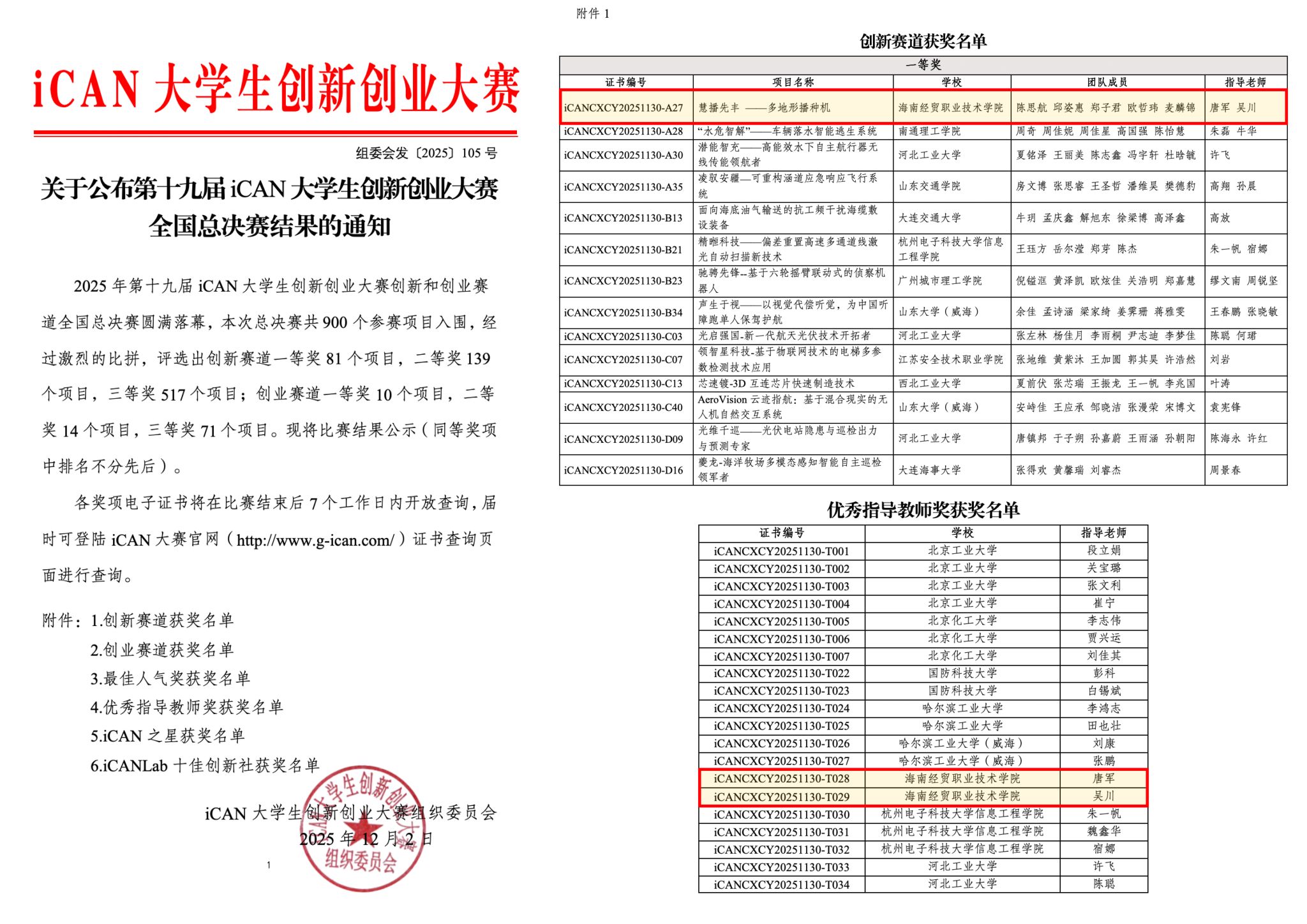 近日,第十九届iCAN大学生创新创业大赛全国总决赛在杭州落下帷幕。kaiyun登录中国入口登录参赛项目“慧播先丰-多地形播种机”凭借其创新性与应用潜力,荣获创新赛道全国一等奖。该奖项是本届赛事中海南省高校获得的唯一全国一等奖,展现了学校在创新创业教育方面的扎实成效。学校荣获优秀组织奖。