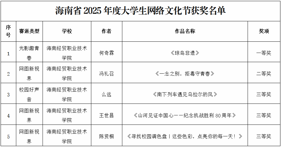 在“大学生网络文化节”推荐评选中,《琼岛非遗》等5项学生作品在“光影趣青春”“网图新视界”“校园好声音”等赛道获奖,其中一等奖1项,二等奖1项,三等奖3项。