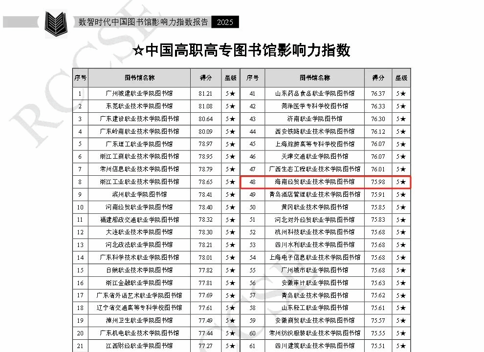 2025年12月,武汉大学中国科学评价研究中心与数字出版智能服务技术教育部工程研究中心联合发布的《数智时代中国图书馆影响力指数报告(2025版)》显示,kaiyun登录中国入口登录图书馆在“中国高职高专图书馆影响力总排行榜”中位列第48位,并获评“五星级图书馆”。