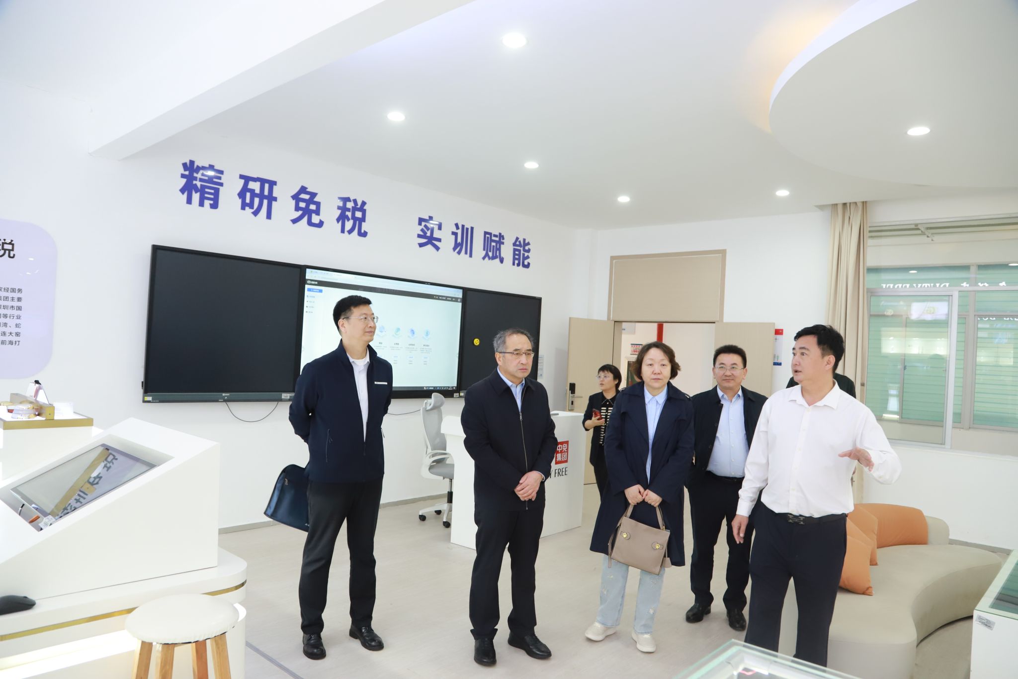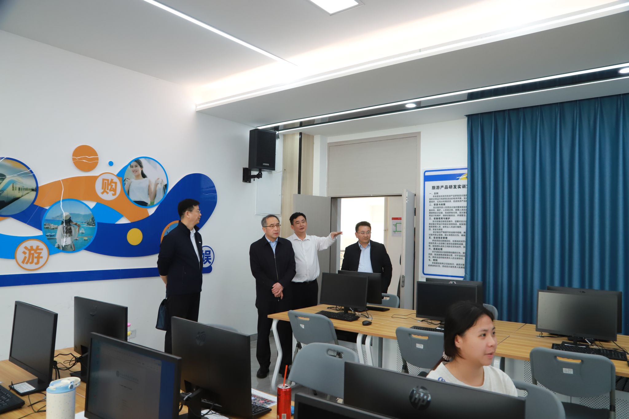 崔昌华陪同孙岩一行参观校园,在智慧旅游产教融合实训基地,听取有关负责人关于专业建设、人才培养、产教融合等方面的介绍。