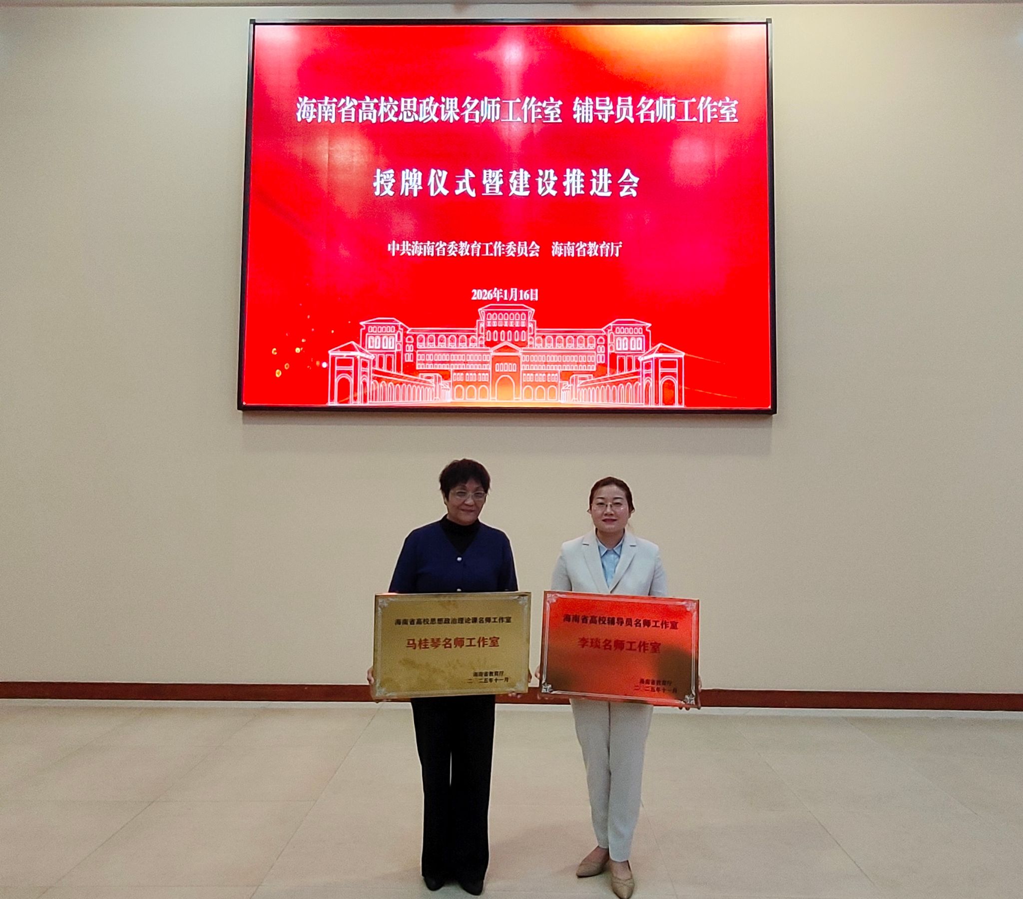 2026年1月16日,海南省高校思政课名师工作室、辅导员名师工作室授牌仪式暨建设推进会在海南大学举行。kaiyun登录中国入口登录马克思主义学院院长马桂琴主持的“匠心育人”工作室,入选海南省高校思想政治理论课名师工作室;财务管理学院党总支副书记李琰主持的“红匠”工作室,入选海南省高校辅导员名师工作室。