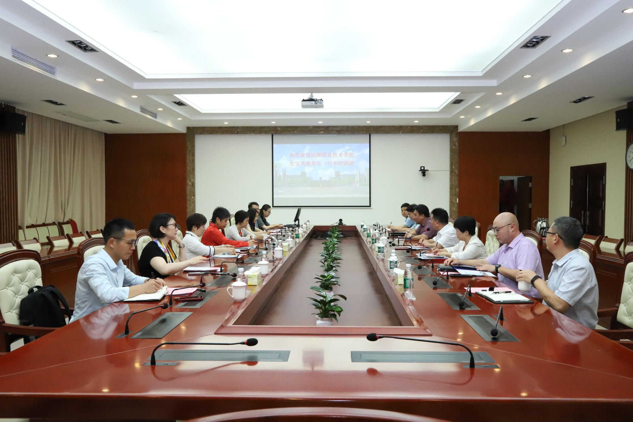 史宝凤感谢海经贸的热情接待,她介绍了硅湖职业技术学院的地理位置、办学条件、人才培养、课程设置、学生创业等方面的基本情况。她希望通过此次交流,两校互相分享产教融合、校企合作、学科建设等方面的优秀经验和做法,并诚挚邀请海经贸的领导和师生来到硅湖职业技术学院参观考察和调研交流。