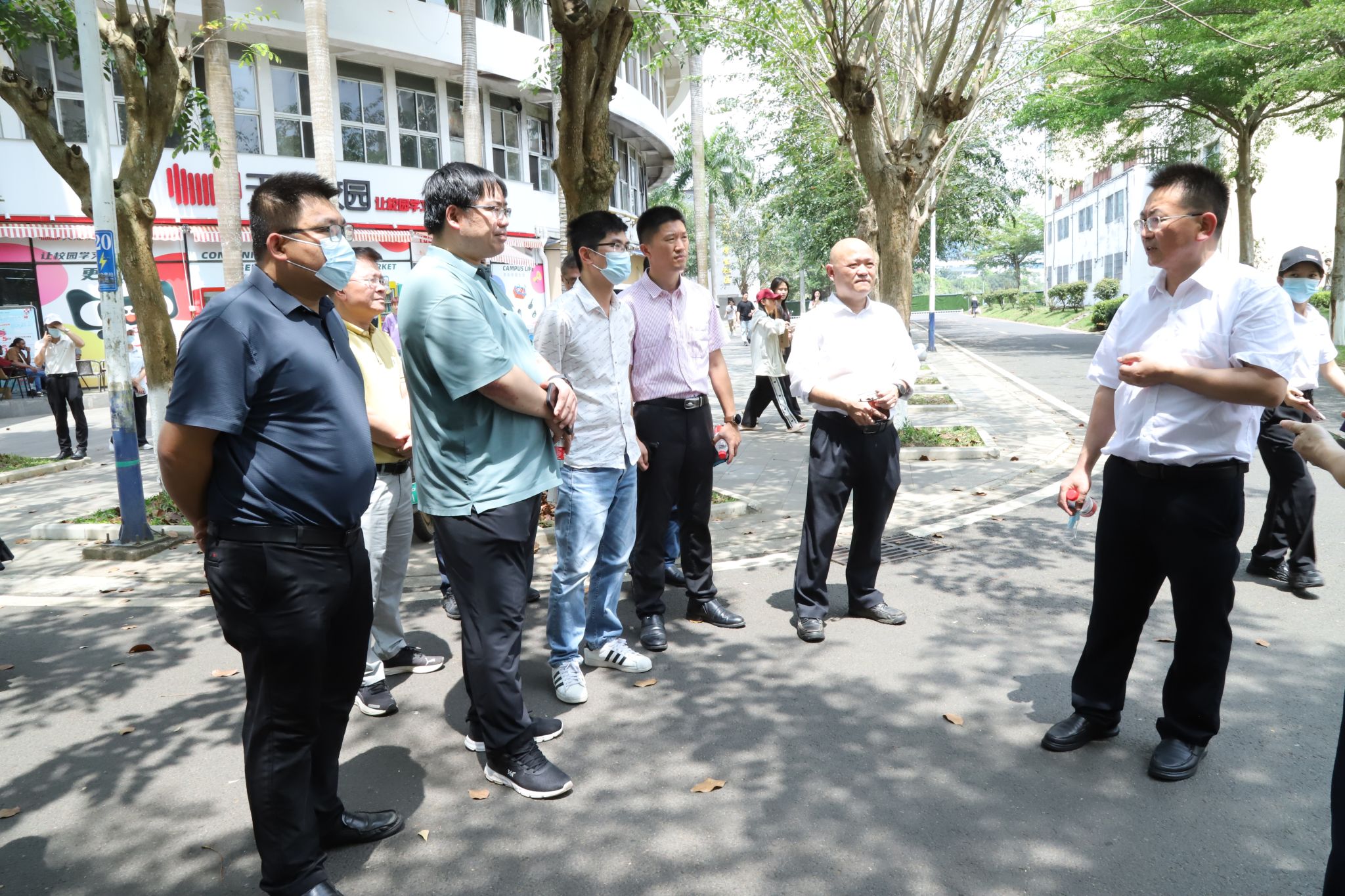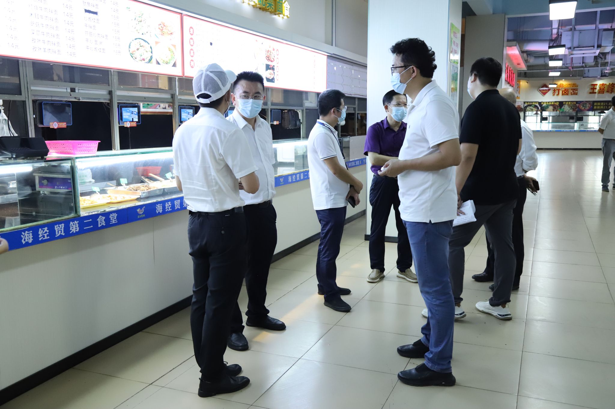 校领导与海口市市场监督管理局桂林洋经济开发区分局、桂林洋高校后勤服务公司有关负责人就食堂卫生、档口经营、校园外卖管理等工作进行交流,并实地走访学校食堂,详细了解各档口的食品原料采购、后厨操作间卫生、食材加工与留样、工作人员健康和师生用餐体验等情况。