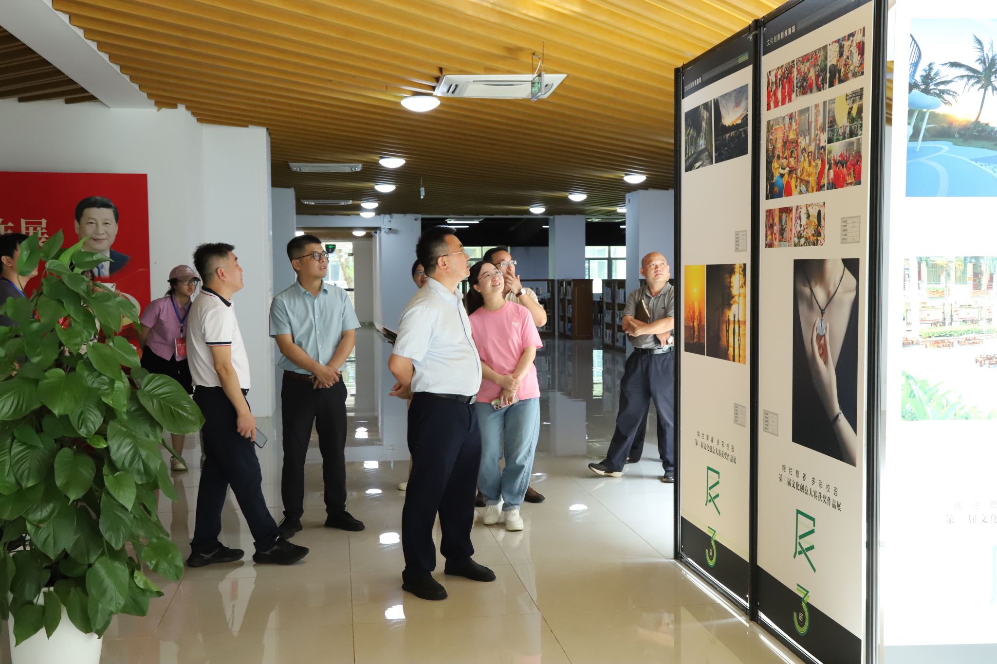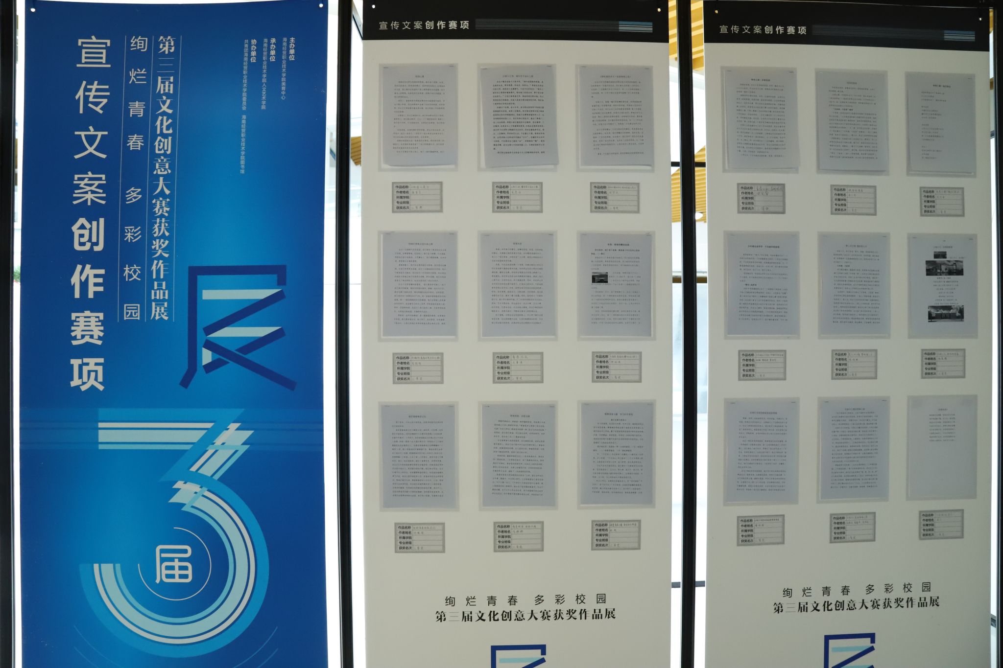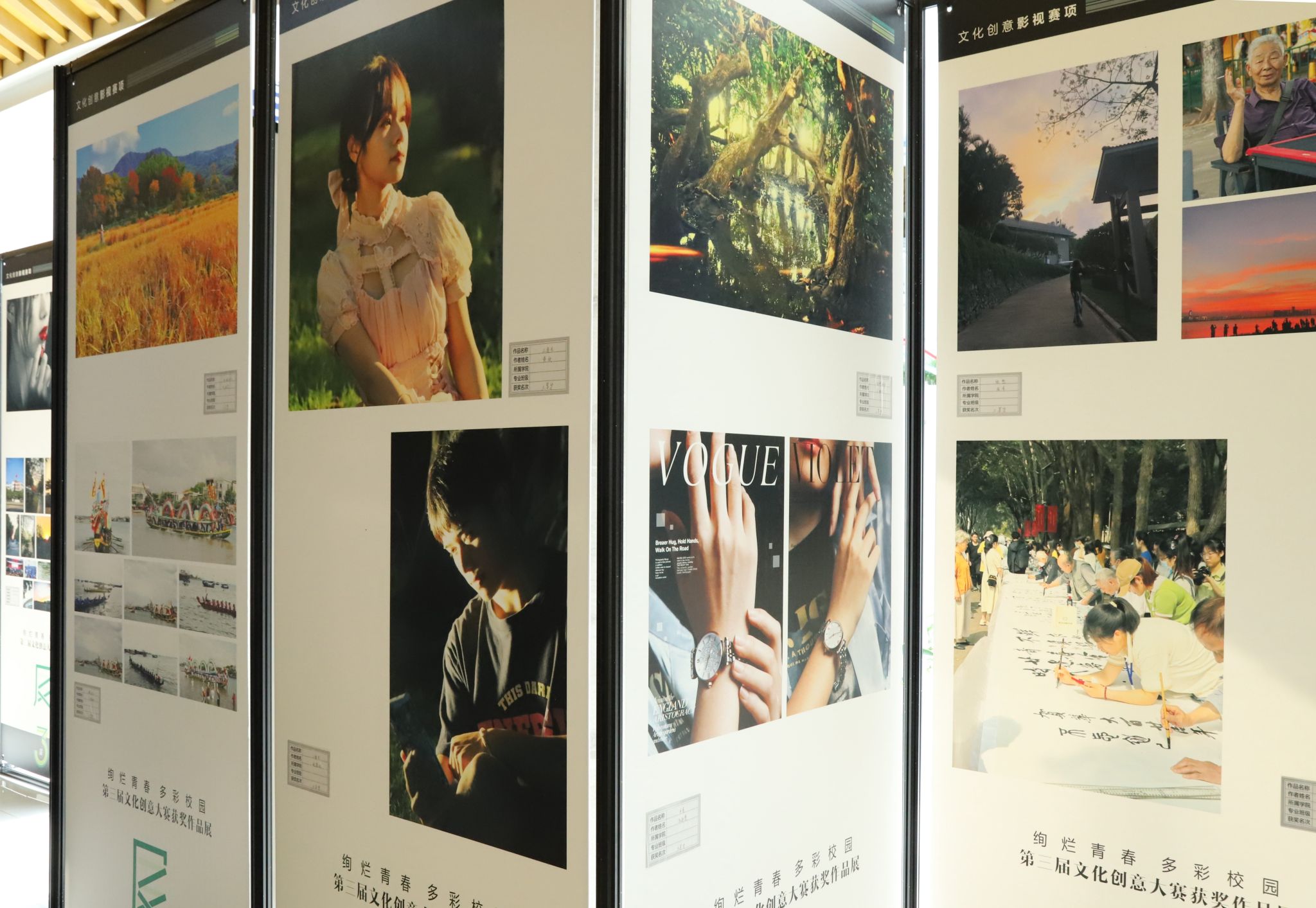 获得比赛一、二、三等奖的学生作品在图书馆中庭展出,作品内容丰富多样,创意十足,充满情感和温度。学子们通过不同的方式表达自己的才华和感悟,有的用镜头捕捉并记录下生活中的精彩瞬间,有的发挥想象力创作出别具一格的文创产品,有的从校园生活出发,用文字抒发对成长和青春的理解。