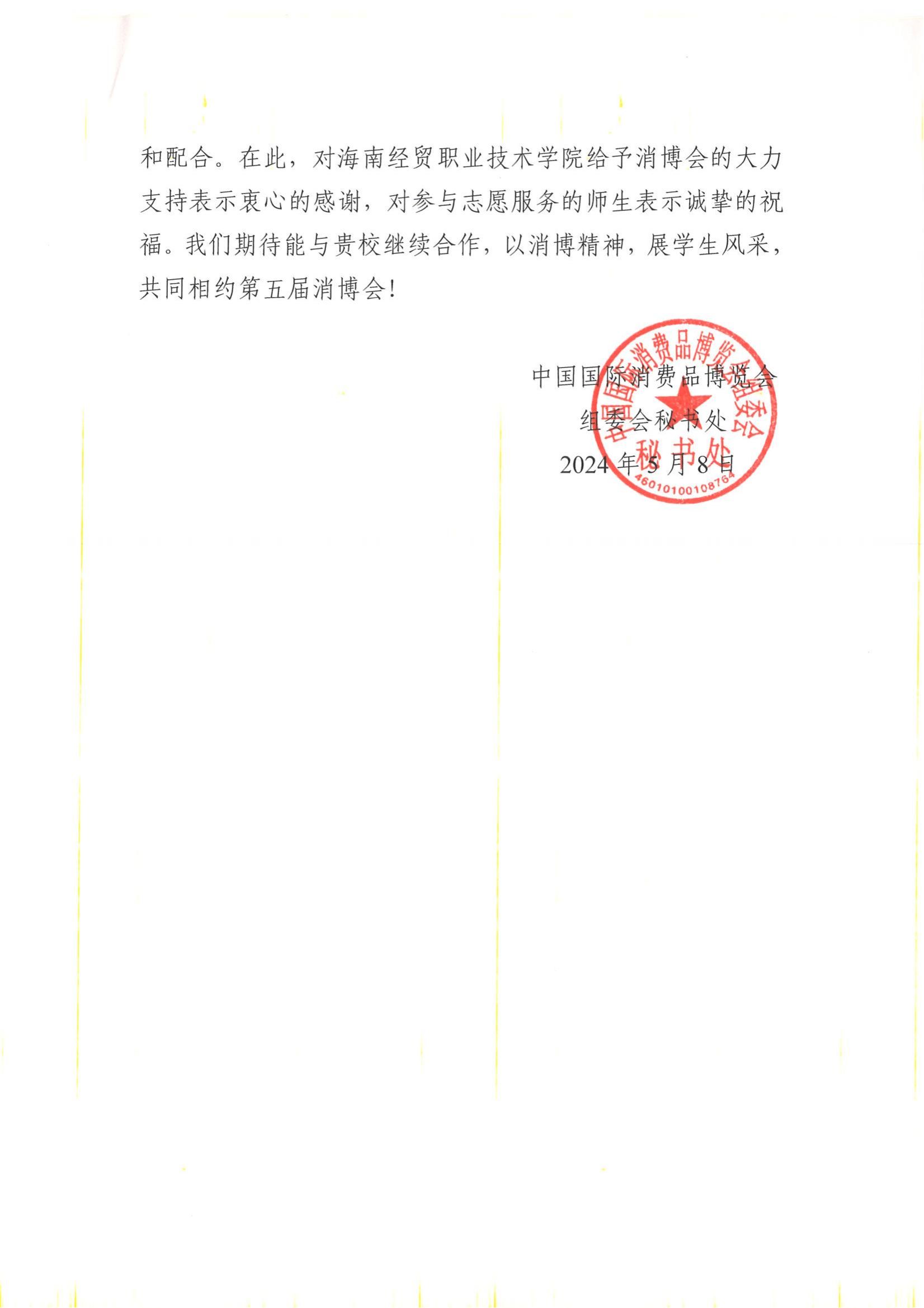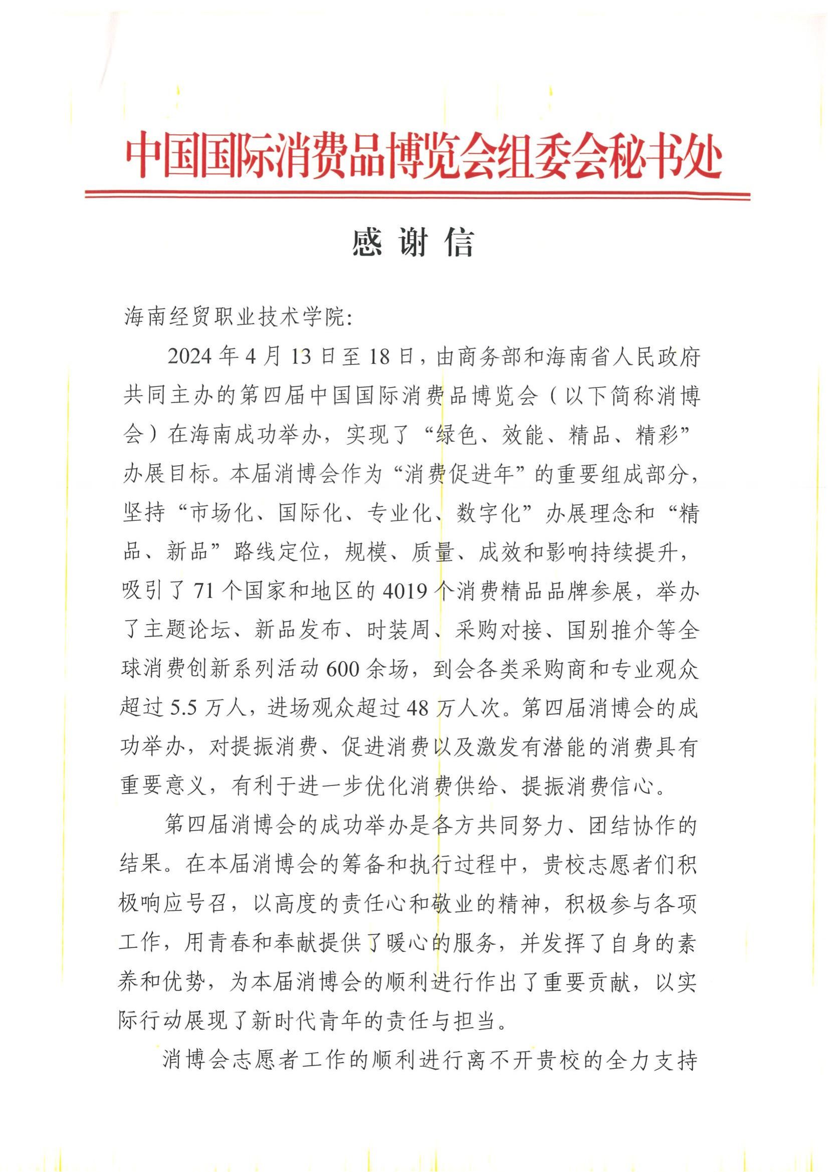近日,中国国际消费品博览会组委会秘书处向kaiyun登录中国入口登录发来感谢信,对学校师生积极参与第四届消博会志愿服务工作给予高度评价,向学校的大力支持表示感谢并致以敬意。
