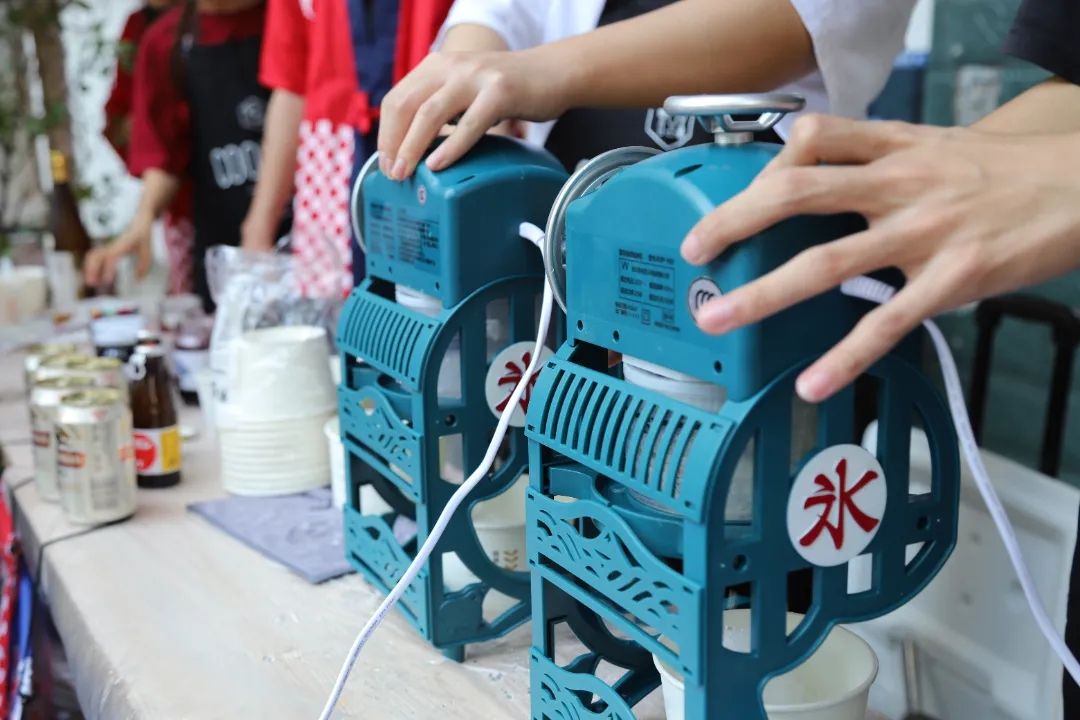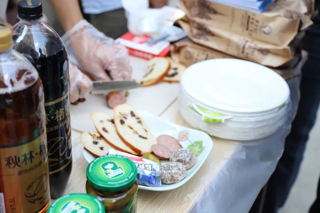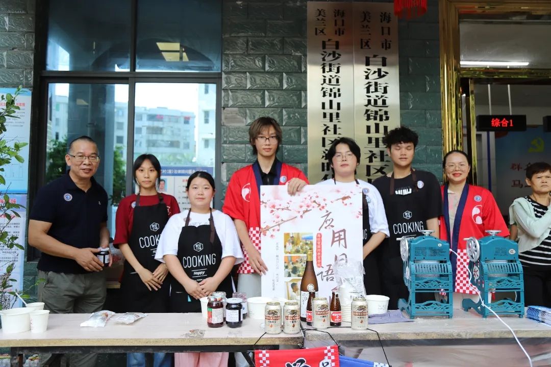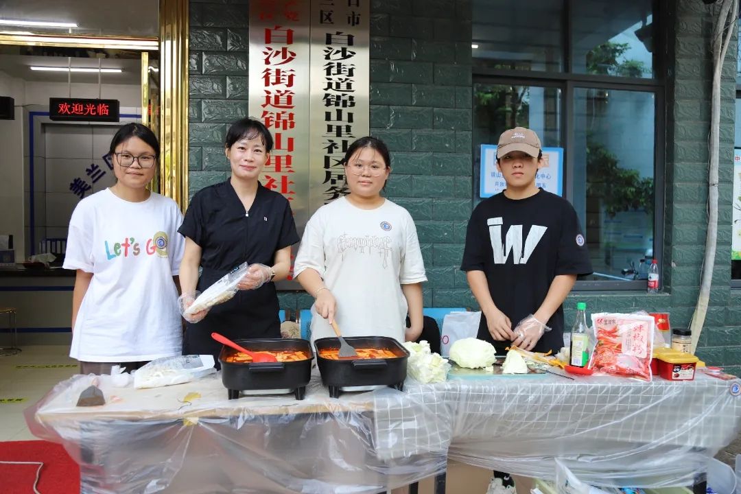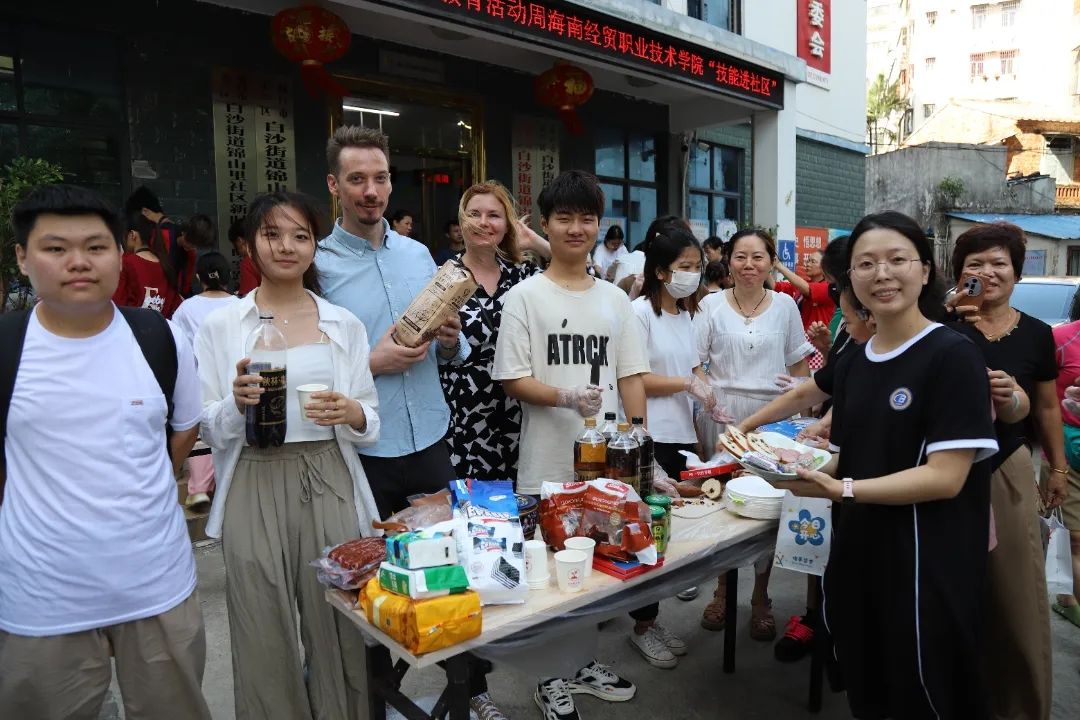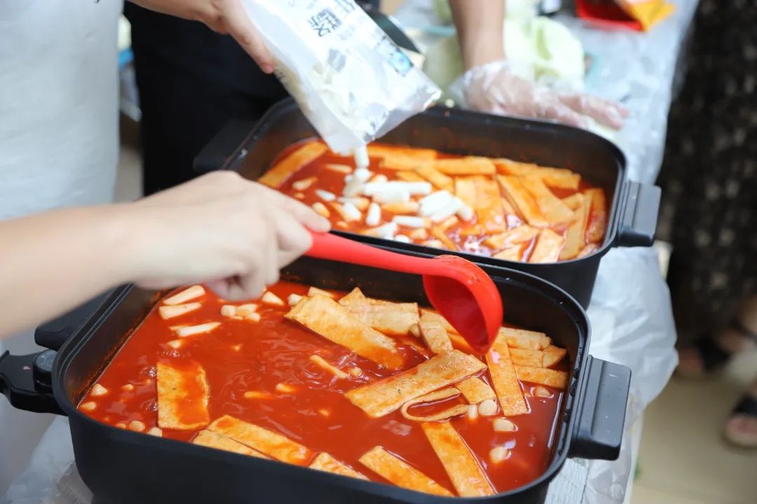 外教安娜斯塔西娅邀请居民朋友们品尝切好的俄罗斯香肠、大列巴面包、巧克力,旁边展位上还有用冰块、果酱、啤酒调配的日本炒冰,用韩式酱料、釜山鱼饼制作的韩国炒年糕……国际教育学院的俄、日、韩外教老师和学生们在社区广场现场制作香气四溢、酸甜可口、冰凉清爽的特色美食,邀请居民们前来品尝,感受异国风情。