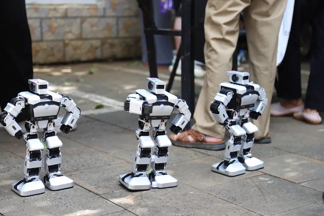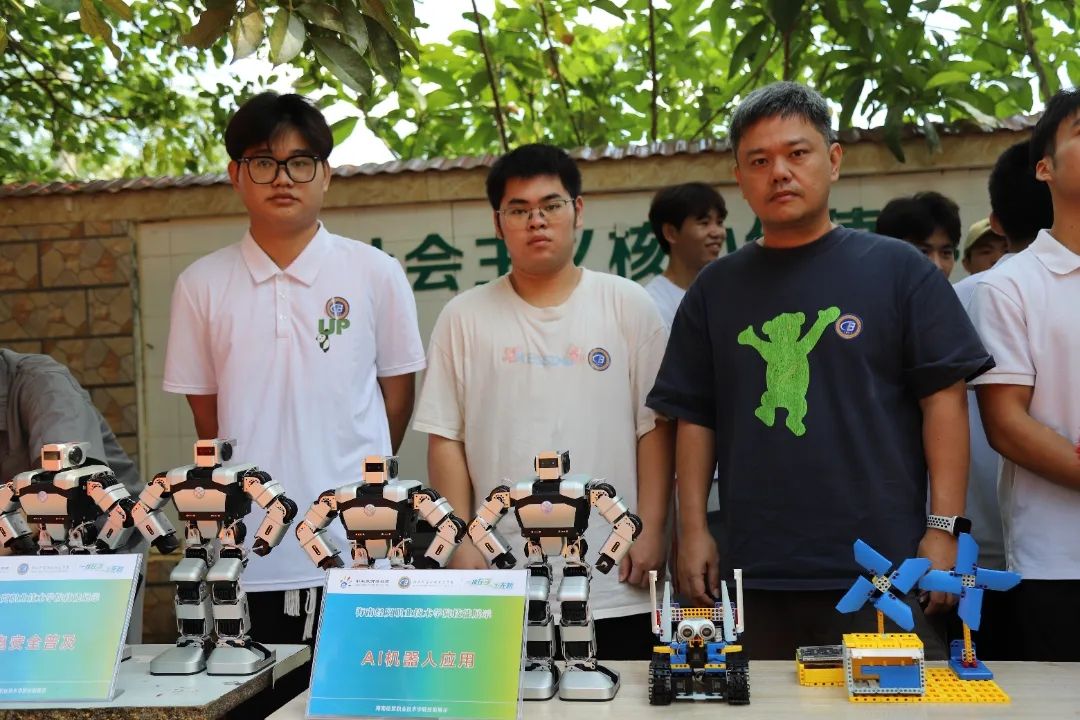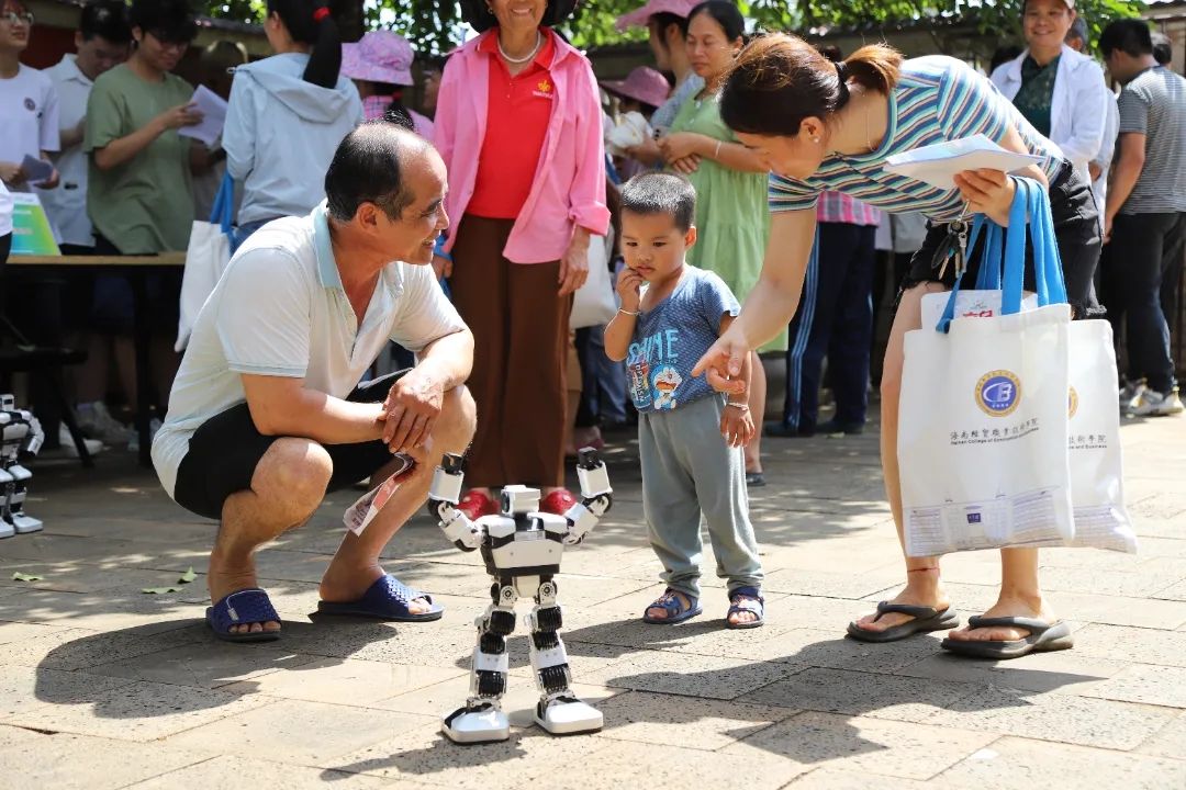 “它好可爱,还会单手俯卧撑呀!”机器人的“动感舞步”带领村民们走进了人工智能的世界。信息技术学院蔡用友等同学带来了人型机器人。“我们的机器人通过高清摄像头,还支持拍照录像、人脸检测等功能,还具有双声道立体声喇叭,能够实现对话聊天等多种语音命令。”
