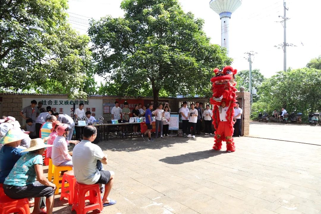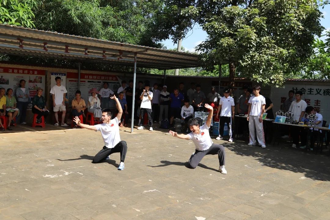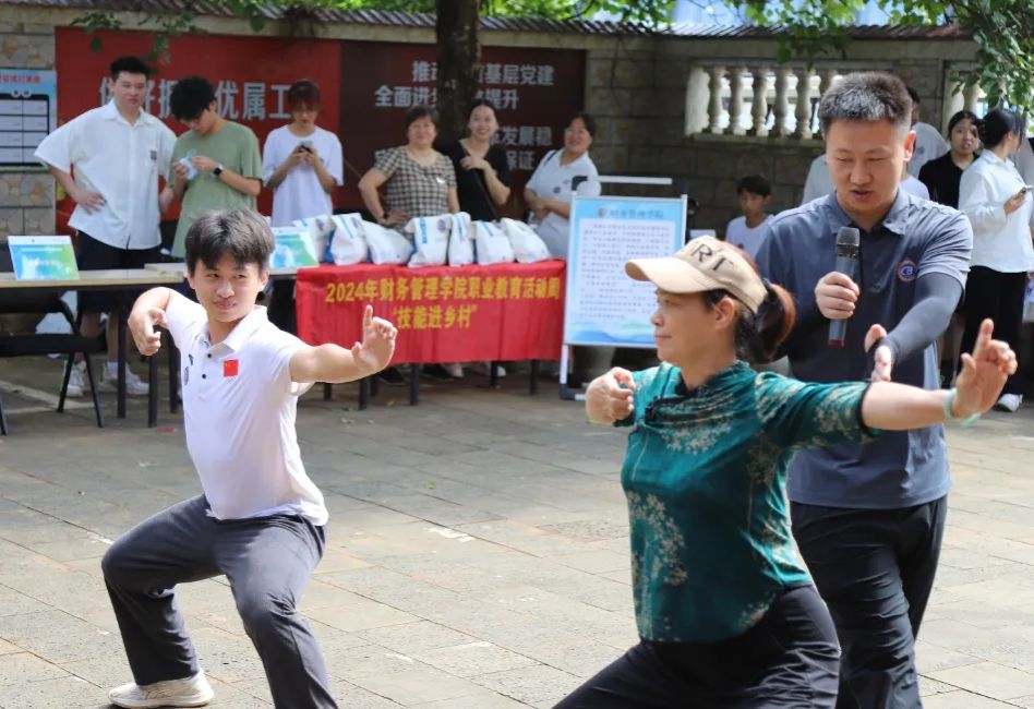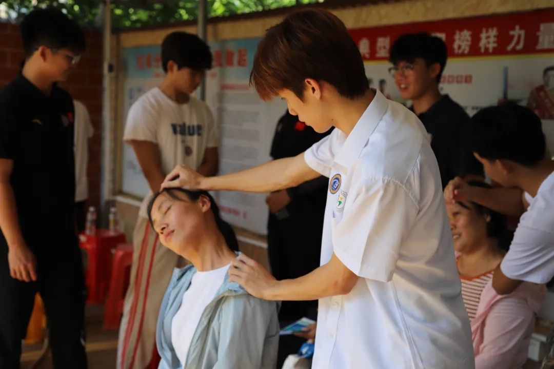 精彩的舞狮表演和武术表演“点燃”了全场的热情。“两手托天理三焦,左右开弓似射雕……”村民们跟着体育与健康学院黎家俊同学练习八段锦招式。专业教师们科学指导如何拉伸,帮助村民们缓解颈部不适。大家积极互动,感受专业肩颈穴位按摩带来的舒适感。