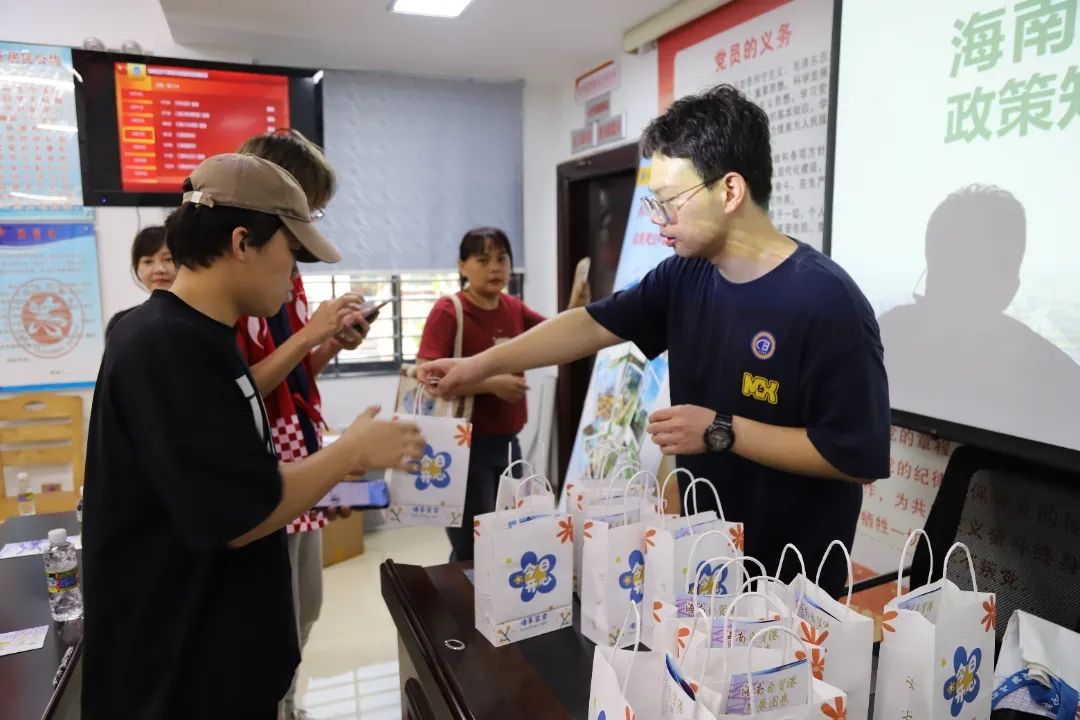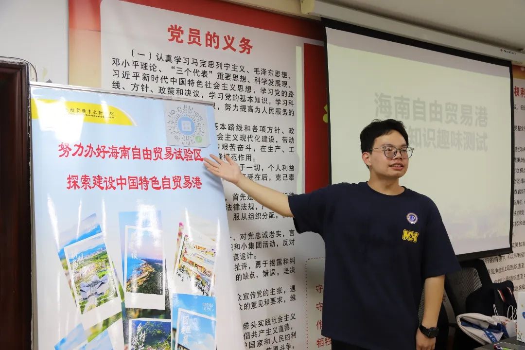 “请大家扫描这个二维码进行答题。”国际贸易学院李浩轩同学引导居民们参与互动问答,向大家讲解海南自由贸易港关税知识和离岛免税政策。“海南自贸港计划在2025年底前实现全岛封关运作。”社区居民们拿起宣传册,更直观地了解未来海南自贸港建设的美好画卷。