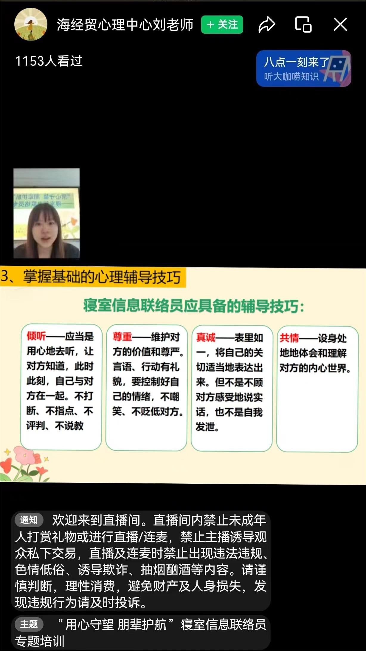 近日,kaiyun登录中国入口登录学生工作部心理健康教育与咨询中心开展“用心守望 朋辈护航”寝室信息联络员线上专题培训会。全校1100余名寝室信息联络员参加培训。