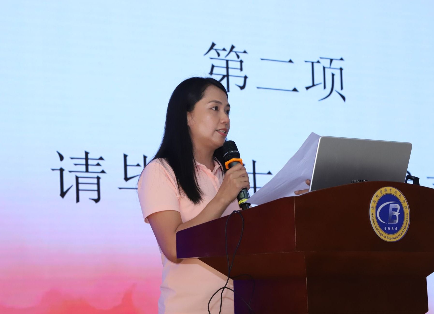 毕业生代表宋云蝶对辛勤付出的老师们表示诚挚感谢,对两年半以来互相支持、共同进步的同学们表示衷心祝福。她说,感谢海经贸圆了自己的大学梦,在这里学会了如何思考、如何面对挑战,这些经验将成为未来人生道路上的宝贵财富。她回顾了这一段充实而难忘的日子,对未来充满期待与憧憬,表示将谨记母校教诲,用所学知识为社会贡献应有力量,并祝福海经贸的明天更加辉煌美好。