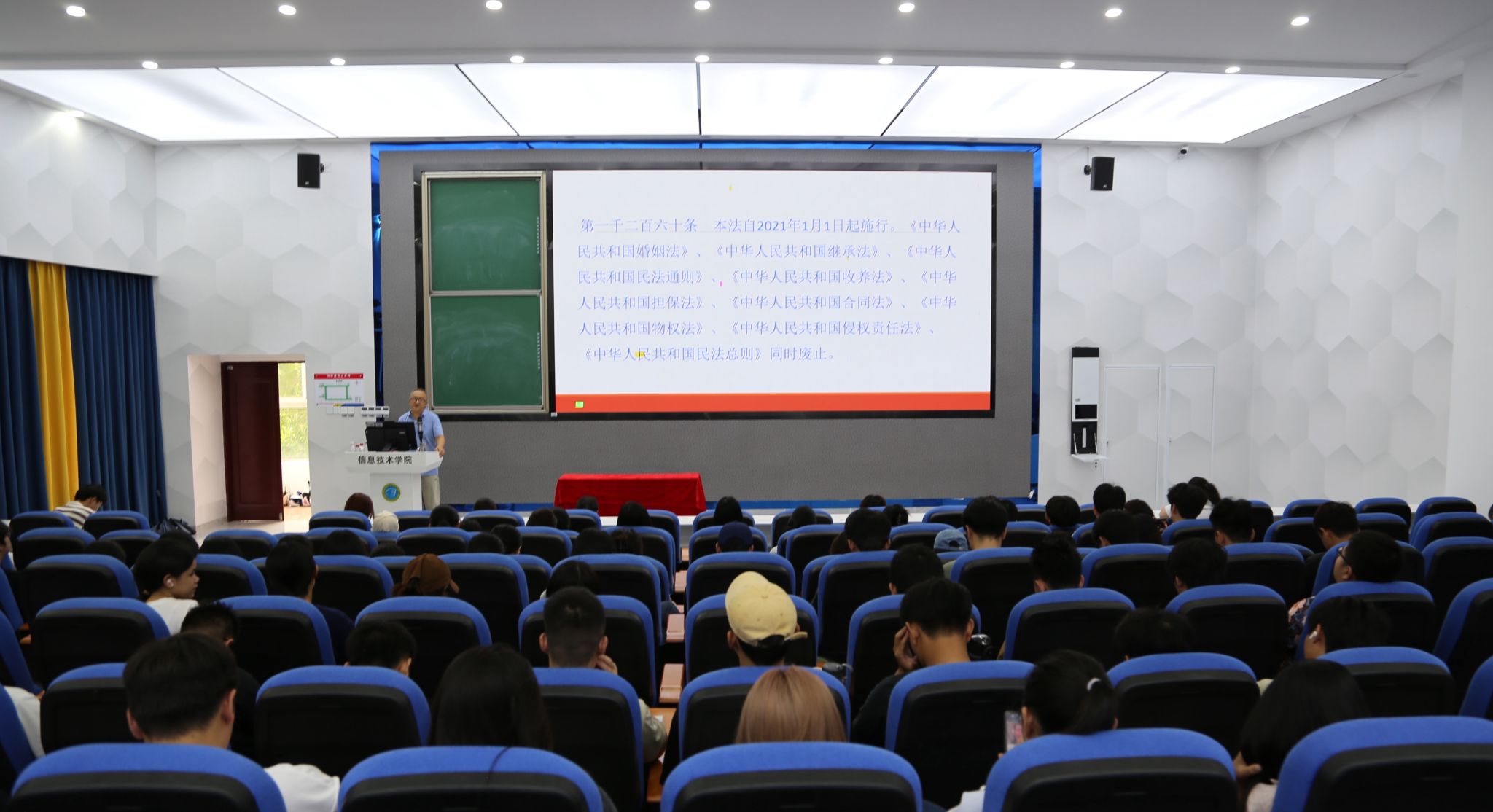 周孝怀介绍了民法典编纂历程、内容结构,深入阐述其重要意义、亮点内容,围绕当前校园欺凌、校园贷、就业歧视等与大学生生活密切相关的问题,以及高空抛物、见义勇为、居住权等社会热点问题,结合近年来发生的各类典型案例,用通俗易懂的语言阐述民法典相关条款及理解应用,与同学们共同交流分析,指导大家在生活中利用民法典维护自身合法权益。他希望青年学生重视学习民法典,自觉学习民法典,提升法治意识和法治素养,树立对法律的敬畏之心,养成办事依法、遇事找法、解决问题用法的习惯。