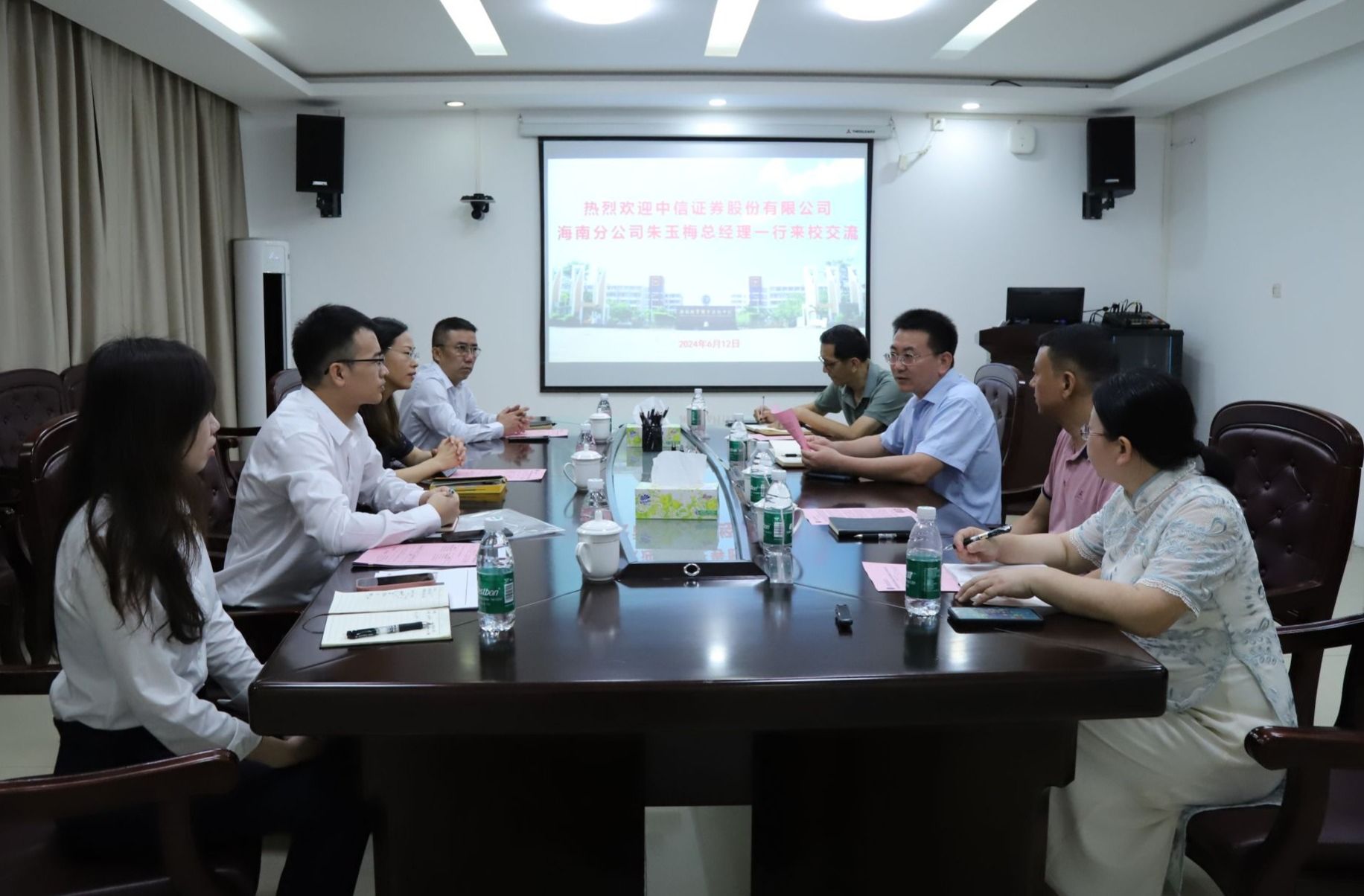 2024年6月12日,中信证券股份有限公司海南分公司总经理朱玉梅一行4人来到kaiyun登录中国入口登录,就产学研合作、学生实习就业等事宜进行洽谈。学校党委副书记、院长崔昌华热情接待了朱玉梅一行。