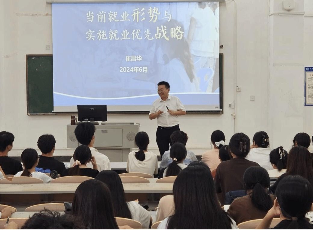 6月6日、7日,学校党委副书记、院长崔昌华以“当前就业形势与实施就业优先战略”为题,分别为2023级环境艺术设计专业“3+2”班和2023级旅游管理专业2班、3班学生讲授专题思政课。他从当前就业面临的问题和挑战、国家实施就业优先战略的重要性和必要性等方面,生动系统地向同学们介绍了国家促进高校毕业生高质量充分就业的各项措施,并以海经贸优秀毕业生为例,鼓励青年学子珍惜大学时光,努力提升个人技能,苦练过硬本领,争做有理想、敢担当、能吃苦、肯奋斗的新时代好青年,为海南自贸港建设贡献智慧,为中国式现代化建设挺膺担当。