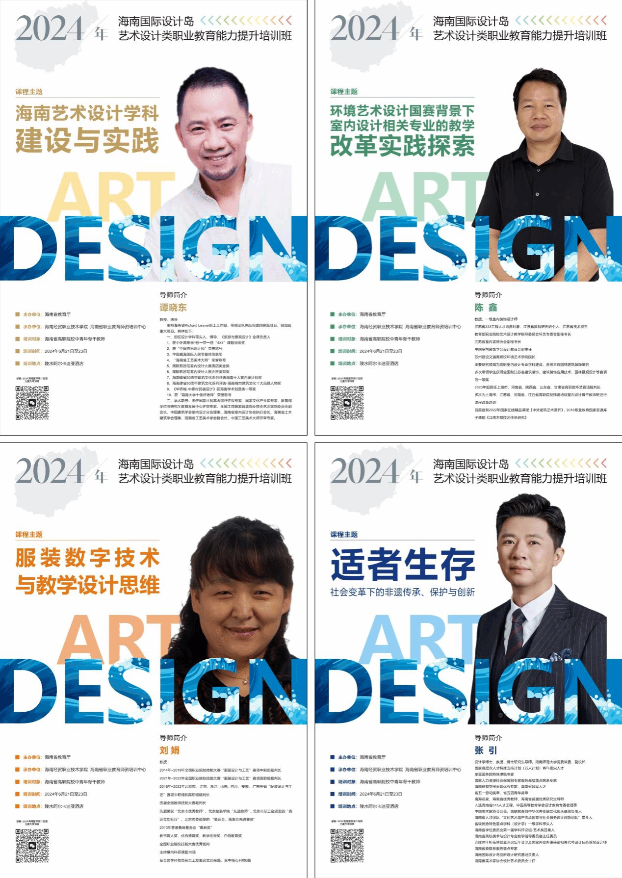 海南师范大学党委常委、副校长、美术学院院长(兼)张引教授,海南大学国际传播与艺术学院谭晓东教授,北京服装学院刘娟教授,苏州城市学院设计与艺术学院陈鑫教授以各自的研究领域为主题,分别为学员们带来了“适者生存——社会变革下的非遗传承、保护与创新”“海南艺术设计学科建设与实践”“服装数字技术与教学设计思维”“环境艺术设计国赛背景下室内设计相关专业的教学改革实践探索”等精彩课程。