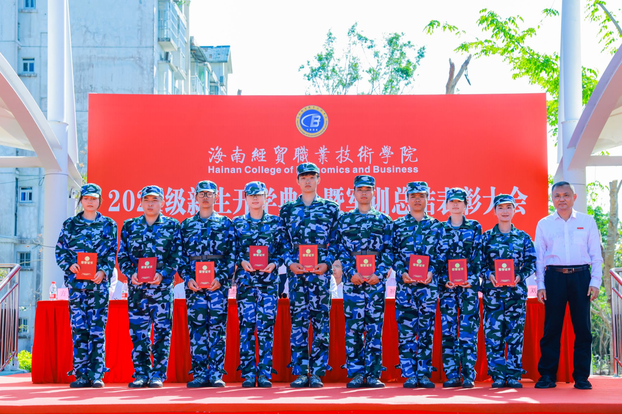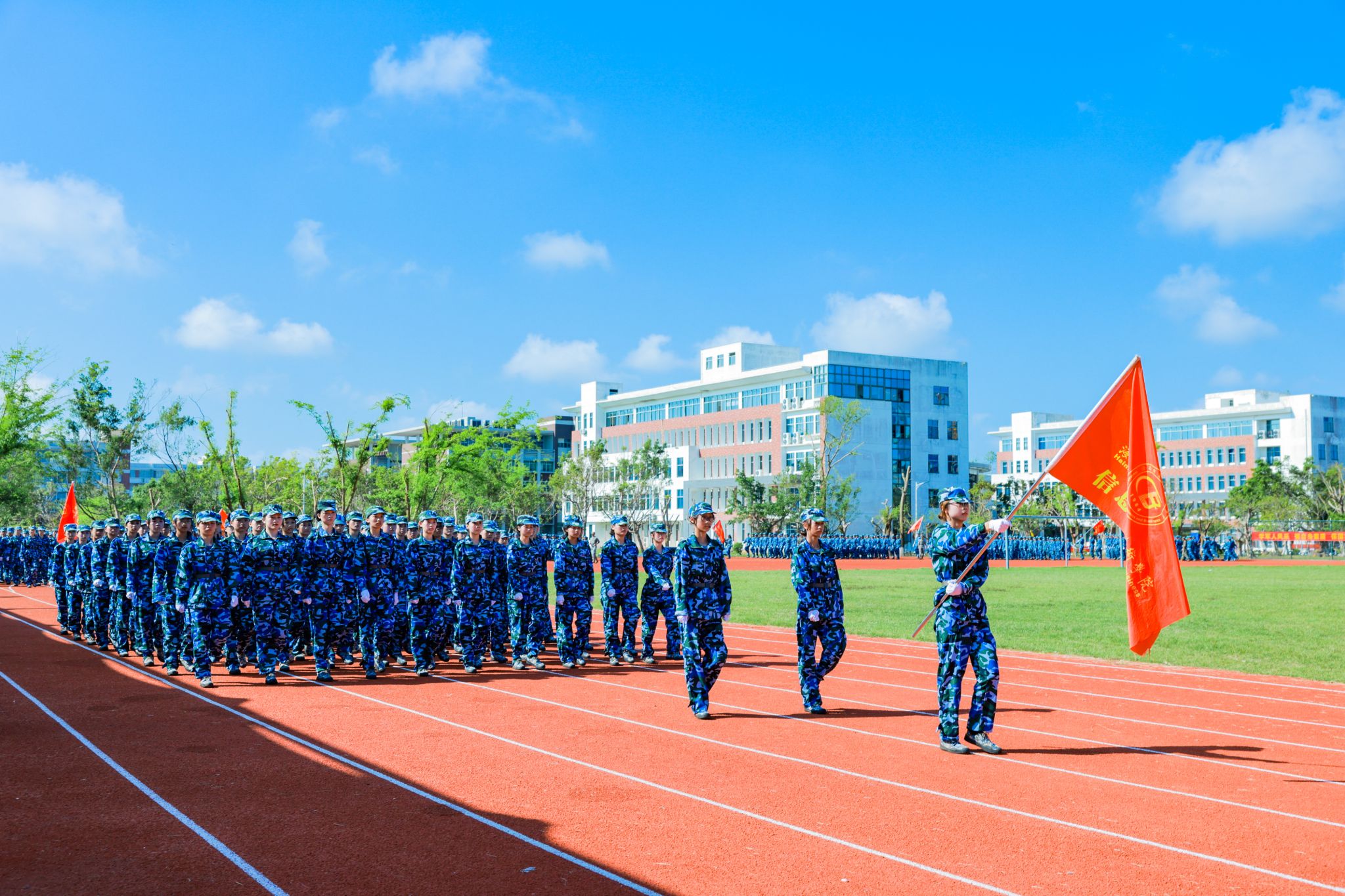 口号激昂,军歌嘹亮,回荡在操场的每一个角落。来自9个二级学院的新生代表方队英姿勃发、步履铿锵,依次昂首阔步经过主席台,充分展现了海经贸学子充满活力的青春风采。在这一刻,他们以优异的表现,向全体师生和教官递交了一份满意的答卷。
