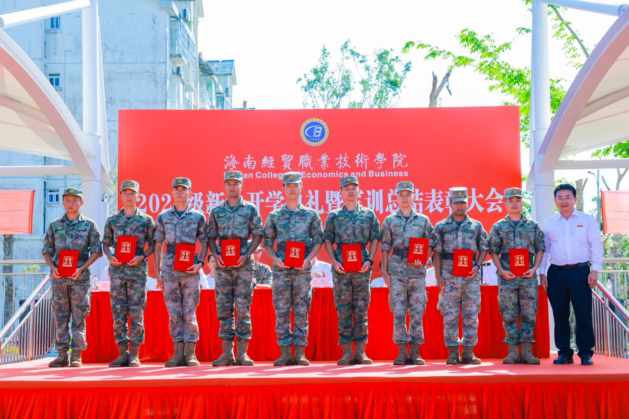 崔昌华向全体新同学表示热烈欢迎,向辛勤付出的承训教官及教职员工致以崇高敬意和诚挚感谢。他说,台风“摩羯”给学校带来了严重破坏,但全体海经贸人众志成城、共克时艰,以团结的意志和坚毅的品格克服重重苦难,实现如期迎新、按时复学,这些精神财富是送给新生们最宝贵的“开学礼物”。他回顾了海经贸的建校历史和近年来取得的成绩,希望同学们把青春的热忱倾注到今天,在蓬勃发展的海经贸堂堂正正地成长成才。他深情寄语新生,一要挺膺担当,立稳报国强国的“鸿鹄志”。牢固树立起为祖国、为人民奋斗奉献的崇高志向,让青春年华在中华民族伟大复兴的新征程上焕发更加绚丽的光彩。二要拥抱理想,敢做仰望星空的“追梦人”。不自我怀疑、不轻易言弃,相信“相信”的力量,在追逐梦想的过程中,发现人生最美的风景。三要追求卓越,当好脚踏实地的“奋斗者”。保持独立思考,扎稳立身立业之根,练就过硬本领,为未来的发展创造更大空间。四要砥砺身心,成为全面发展的“栋梁材”。明天是中华人民共和国七十五周年华诞,我们要感谢先辈们创造的美好生活,增强忧患意识,提高政治觉悟,继续发扬军训培塑起来的良好作风,真正成为德智体美劳全面发展的社会主义建设者和接班人。