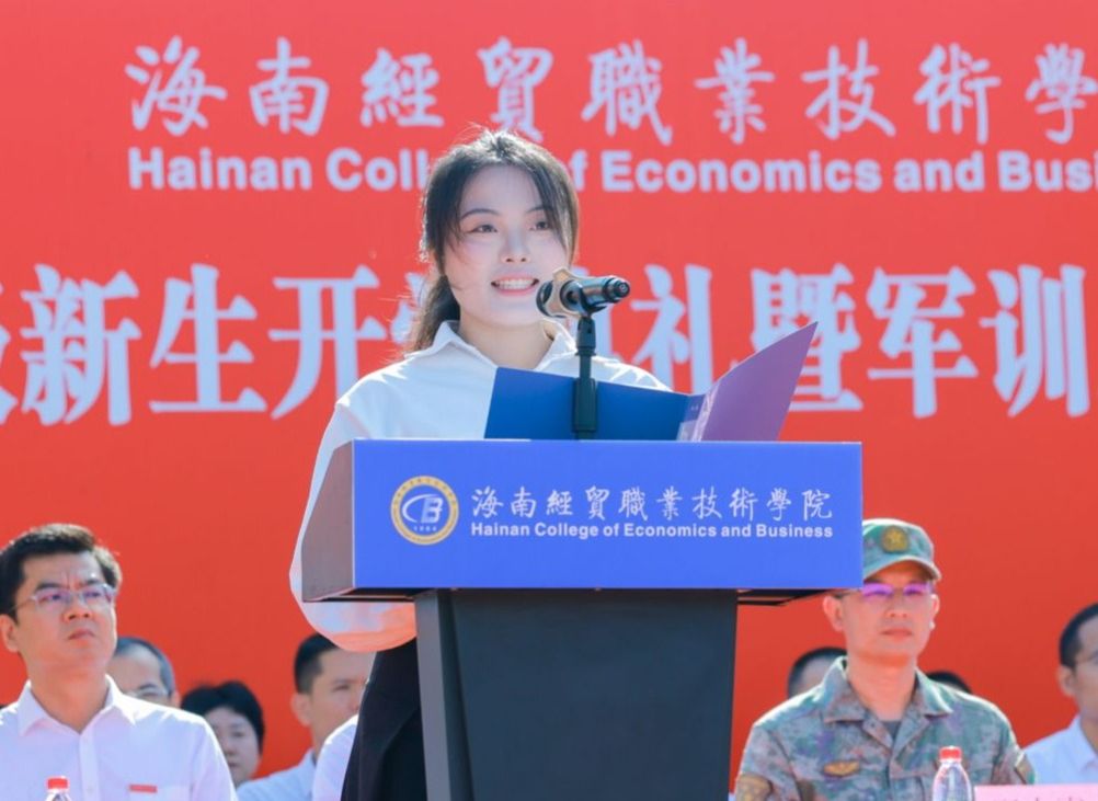 财务管理学院学生叶青青作为老生代表发言。“海经贸为我们提供了广阔的舞台,大家要以满腔热情融入到新的环境和集体中,勇往无前、不惧挑战。”她分享了入学以来充实美好的时光,希望2024级新同学们学好专业知识、练好技术能力,提高主动性和能动性,积极参加丰富的校园文化活动,不断提升自身综合素质能力,书写不负时代的青春华章。