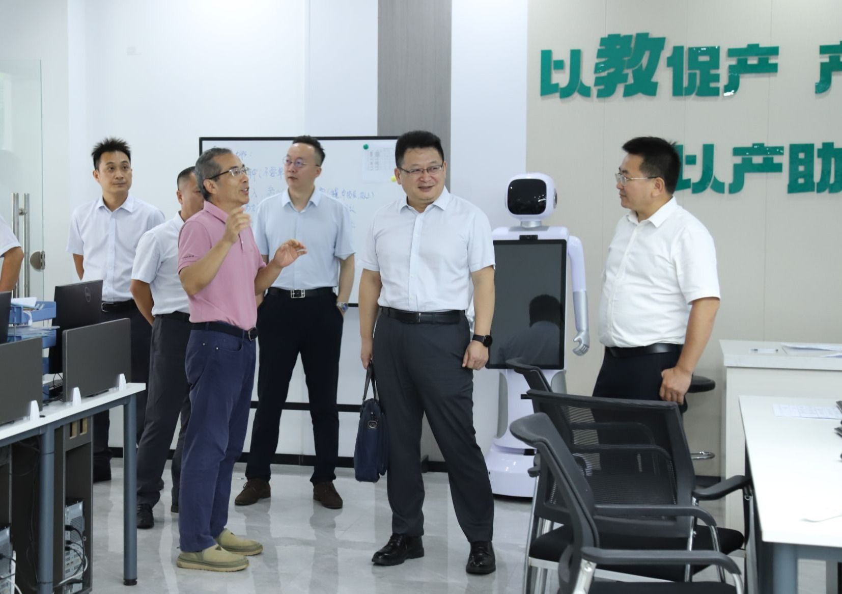崔昌华陪同李勇一行参观校园,先后来到智慧财务产教融合实践基地和图书馆,介绍学校基础设施建设、招生就业、人才培养、产教融合、“双高”建设的有关情况。