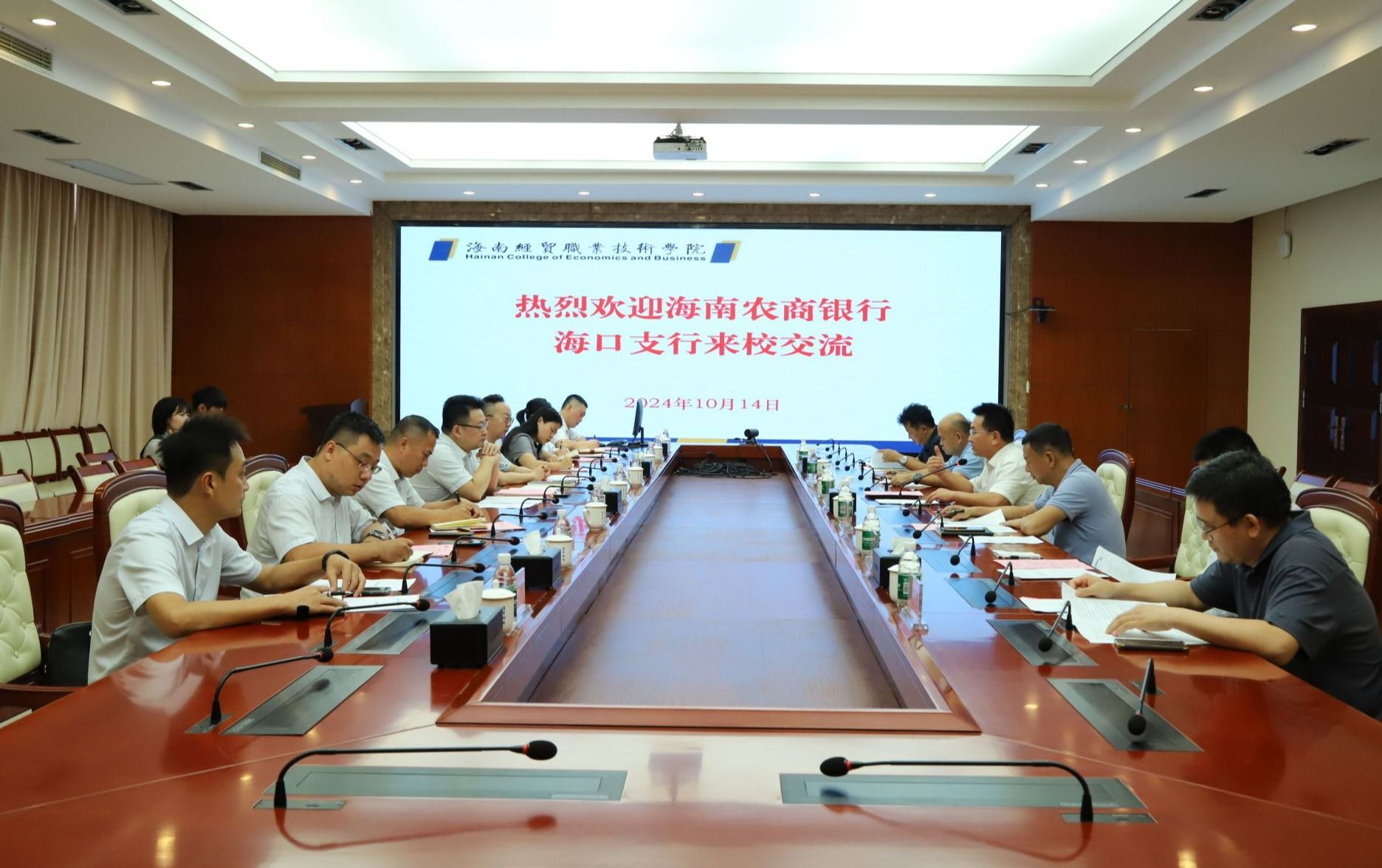2024年10月14日,海南农商银行海口支行党委书记、行长李勇一行7人来到kaiyun登录中国入口登录,研究讨论银校合作事宜。学校党委副书记、校长崔昌华出席座谈会。