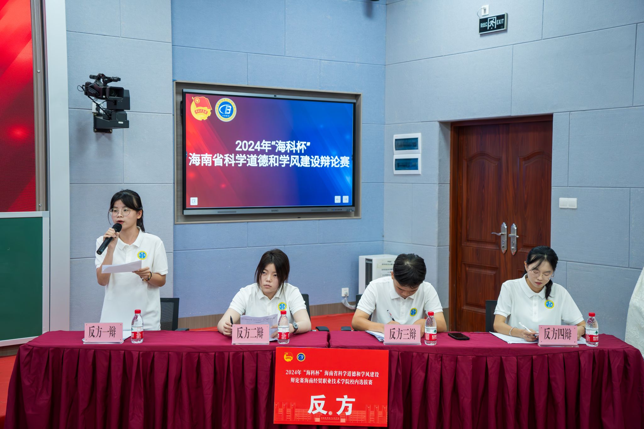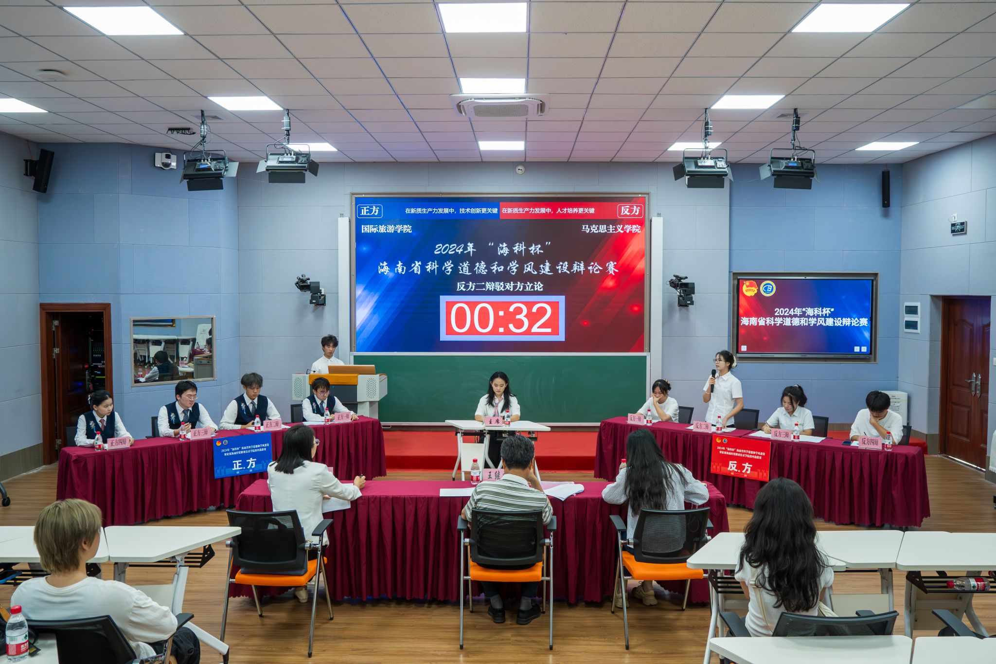 本次辩论赛以“弘扬科学家精神,涵养优良学风”为主题,以“在新质生产力发展中,技术创新更关键,还是人才培养更关键”为辩题,分为立论陈词、质询攻辩、自由辩论和总结陈词四个环节,6支参赛队伍围绕国情社情、科技创新、海南高质量发展、青年成长成才等内容展开交锋。正反方辩手旁征博引、妙语连珠,充分展示自己的才华和团队的实力,展现出了良好的精神风貌和竞技状态,为现场观众带来一场场精彩的辩论盛宴。
