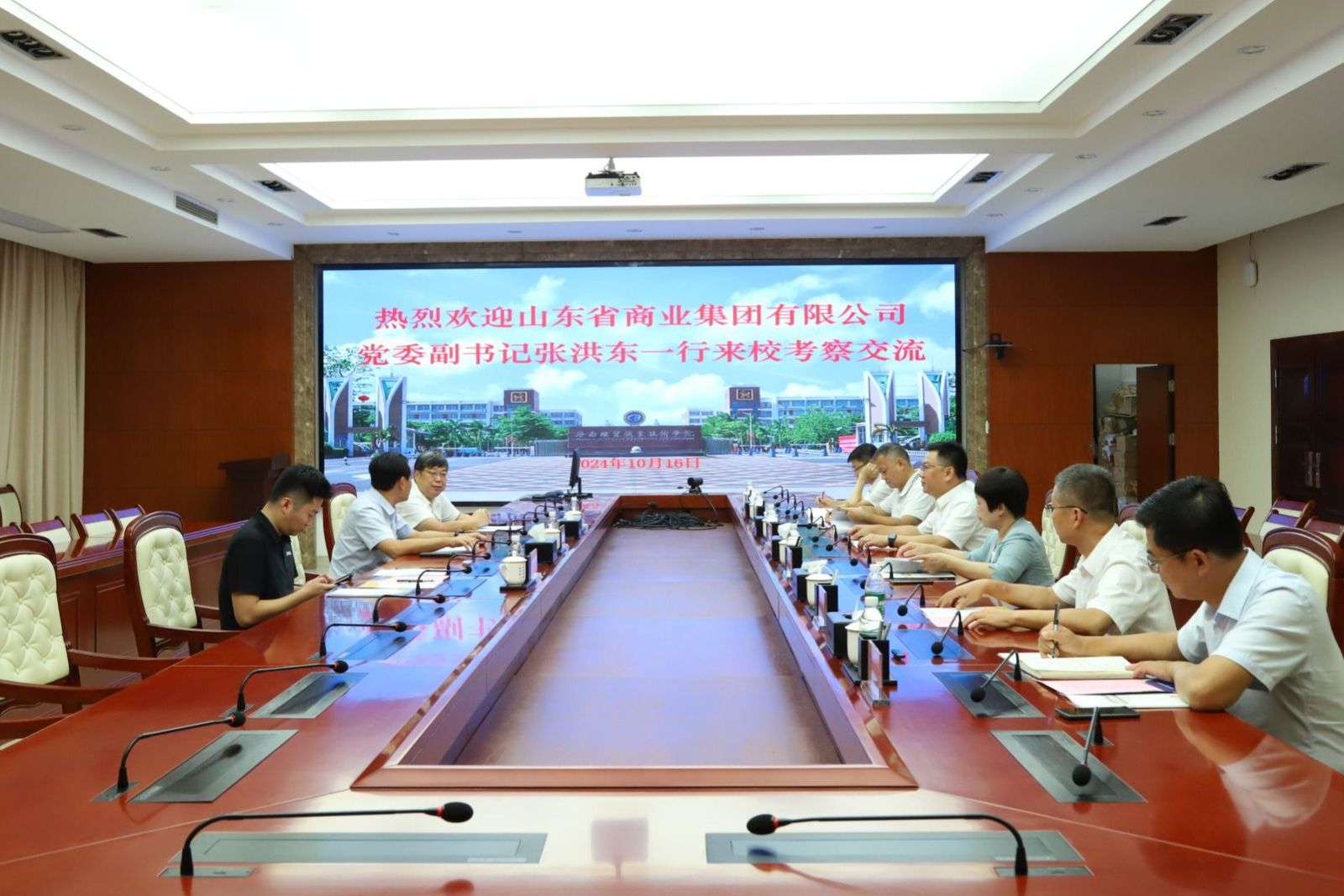 2024年10月16日,山东省商业集团有限公司(简称:鲁商集团)党委副书记、董事张洪东,山东商业职业技术学院党委书记张志东一行3人来到kaiyun登录中国入口登录,就推动职业教育合作等事宜进行交流。学校党委书记王华、党委委员、副校长万力维,党委委员、纪委书记、监察专员符史杭,党委委员、副校长刘文斌,党委委员田小林、方天海出席会议。