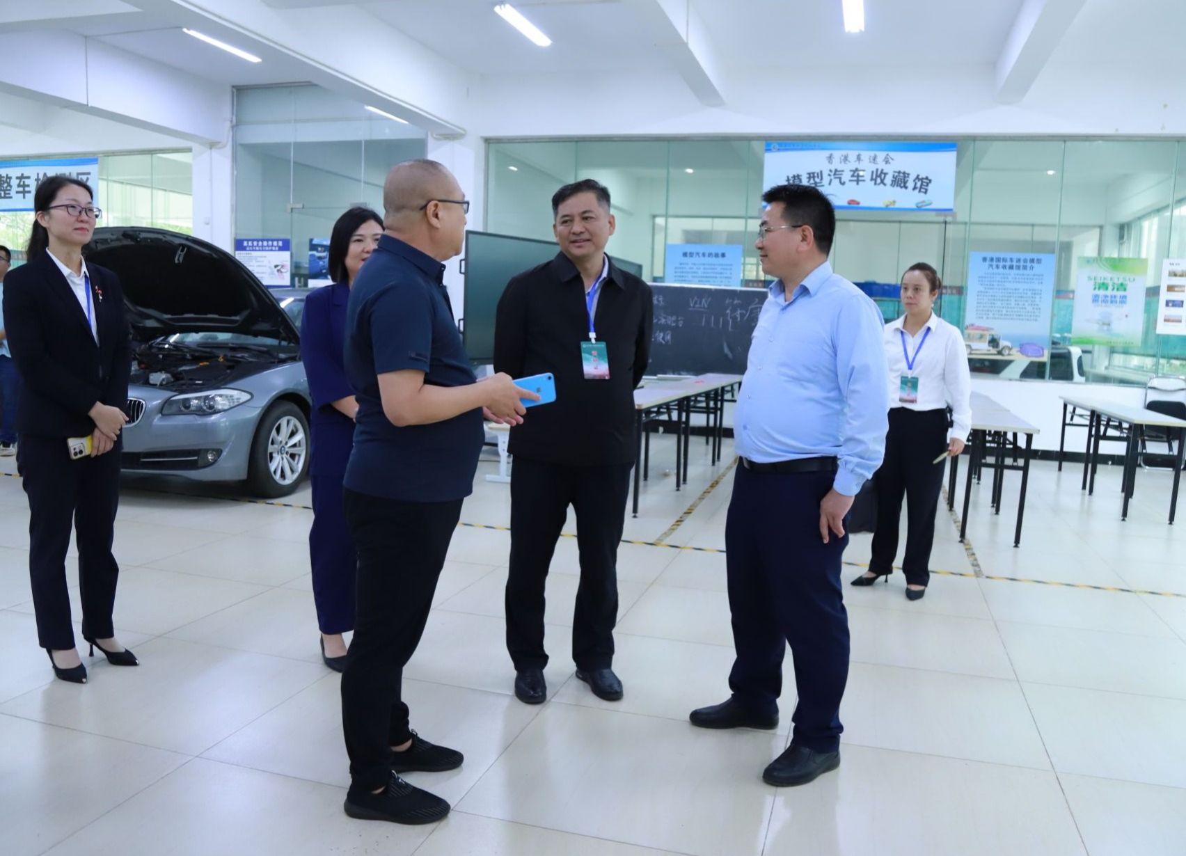 崔昌华陪同莫文基一行参观校园,先后来到数智财务产教融合实践基地、汽车检测与维修实训中心、新一代信息技术ICT产教融合基地和智慧旅游产教融合实训基地,介绍实训室建设、产教融合、校企合作、人才培养等方面情况。