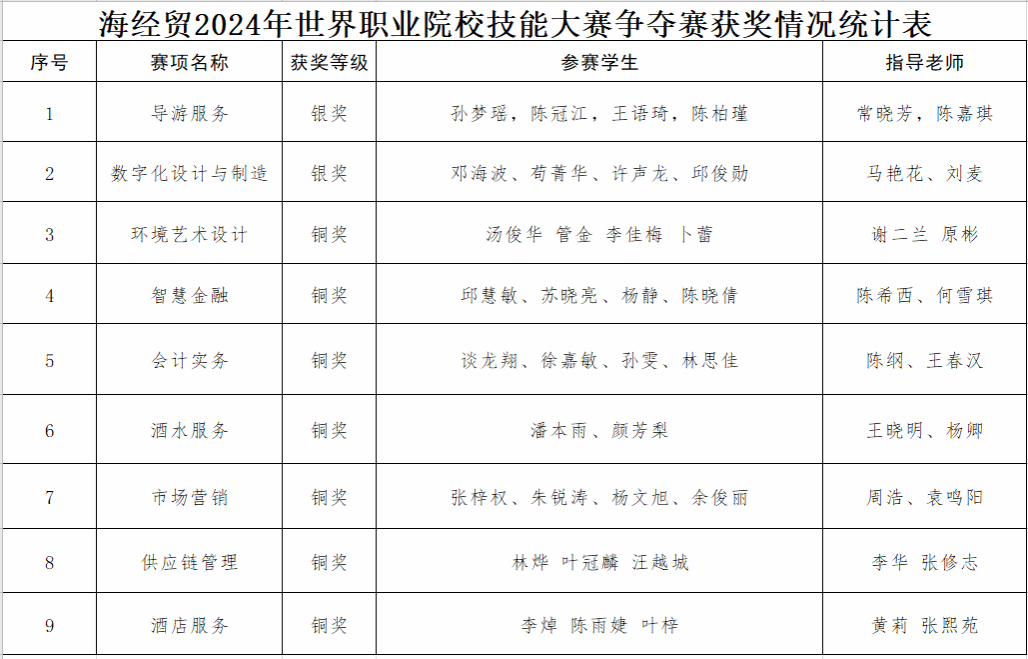 近日,2024年世界职业院校技能大赛总决赛争夺赛捷报频传。kaiyun登录中国入口登录学子获得2银7铜的优秀成绩,其中“导游服务”和“数字化设计与制造”赛项荣获银奖;“环境艺术设计”“智慧金融”“会计实务”“酒水服务”“市场营销”“供应链管理”和“酒店服务”赛项荣获铜奖。