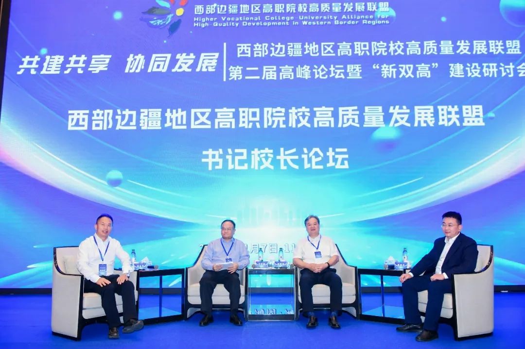 国家教材委员会专家委员、上海市职业教育协会会长马树超主持书记校长高峰论坛,周建松、杨金华、崔昌华围绕“西部边疆地区高职院校职业教育何为”等问题充分交流、碰撞思想。